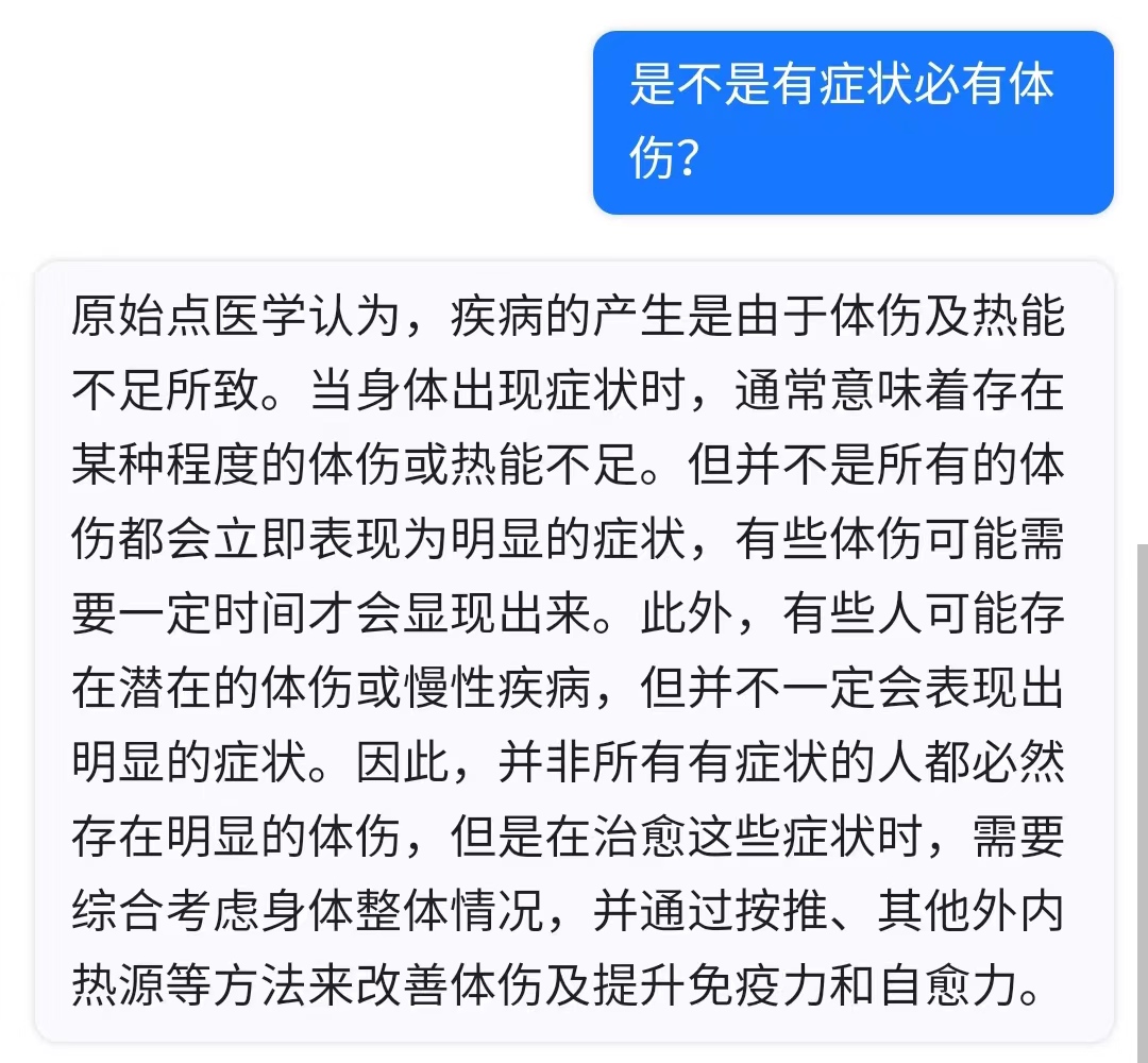 原始点医学认为,疾病的产生是由于体伤及热能不足所致。当身体出现症状时,通常意味着存在某种程度的体伤或热能不足。但并不是所有的体伤都会立即表现为明显的症状,有些体伤可能需要一定时间才会显现出来。此外,有些人可能存在潜在的体伤或慢性疾病,但并不一定会表现出明显的症状。因此,并非所有有症状的人都必然存在明显的体伤,但是在治愈这些症状时,需要综合考虑身体整体情况,并通过按推、其他外内热源等方法来改善体伤及提升免疫力和自愈力。