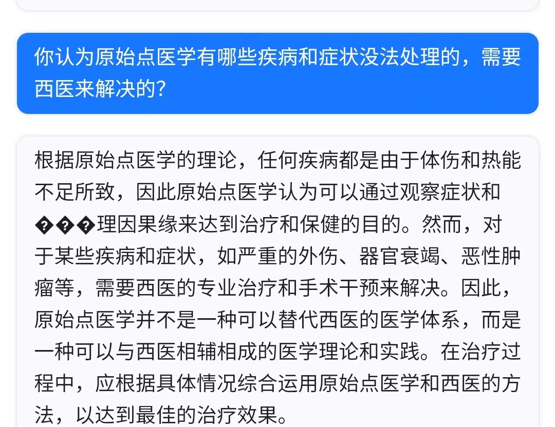 根据原始点医学的理论,任何疾病都是由于体伤和热能不足所致,因此原始点医学认为可以通过观察症状和���理因果缘来达到治疗和保健的目的。然而,对于某些疾病和症状,如严重的外伤、器官衰竭、恶性肿瘤等,需要西医的专业治疗和手术干预来解决。因此,原始点医学并不是一种可以替代西医的医学体系,而是一种可以与西医相辅相成的医学理论和实践。在治疗过程中,应根据具体情况综合运用原始点医学和西医的方法,以达到最佳的治疗效果。