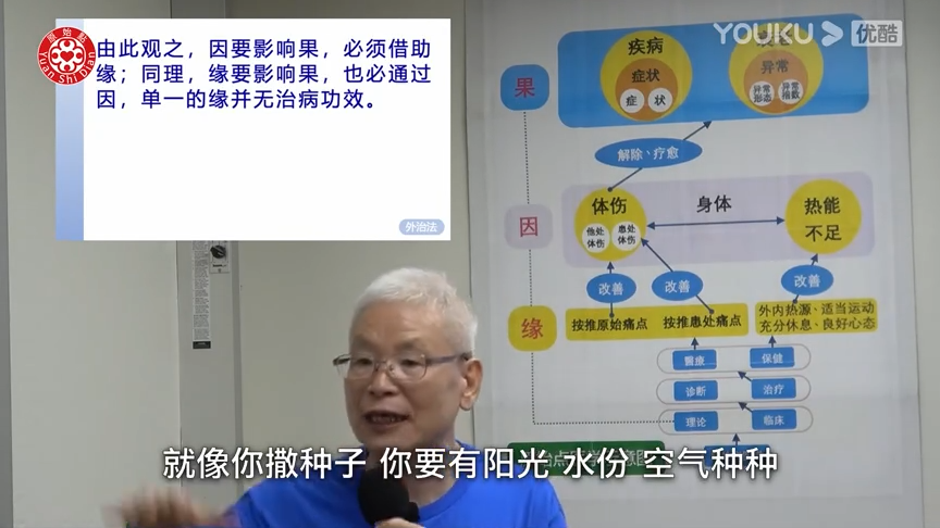 张医师:很容易看懂这一段,总之,缘,外治法,医疗与保健都不能说有治病功效,实际上如果要治病,终须要身体恢复运作,这个如何运作?按推通过缘,按推,热源,皆其他保健等助缘,皆须透过这一系列,热能作用和组织器官的运作,这里顺畅了,自然没有体伤了,这些皆须因,一定要透过因,免疫力,自愈力,来达到自我疗愈的地步,简单的讲,所以由此观之,因如果要影响果,缘来改善因,同样,缘要影响果,必须透过因,结论就是单一的缘,你也可以结论写出单一的缘,单一的因都不能治病,就像单一的因,你有因未必有果,你还要有缘,就像你撒种子,你要有阳光、空气、水,才能长出果树一样;