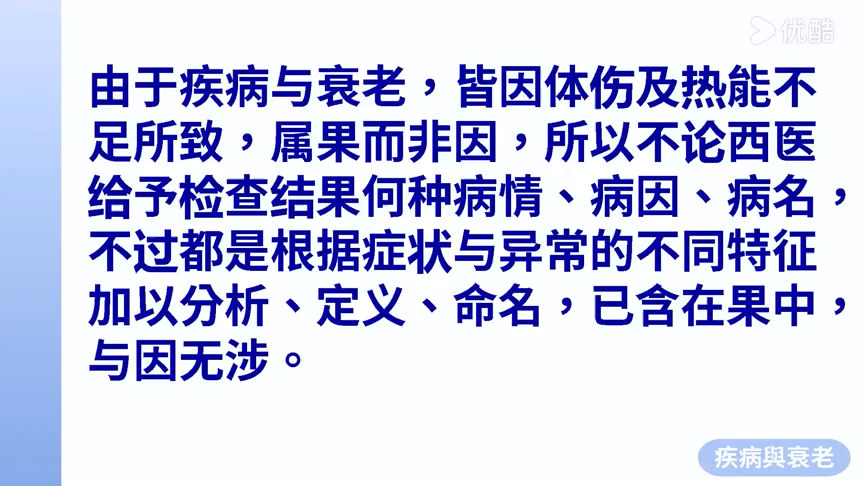 由于疾病与衰老,皆因体伤及热能不足所致,属果而非因,所以不论西医给予检查结果何种病情、病因、病名,不过都是根据症状与异常的不同特征加以分析、定义、命名,已含在果中,与因无涉。