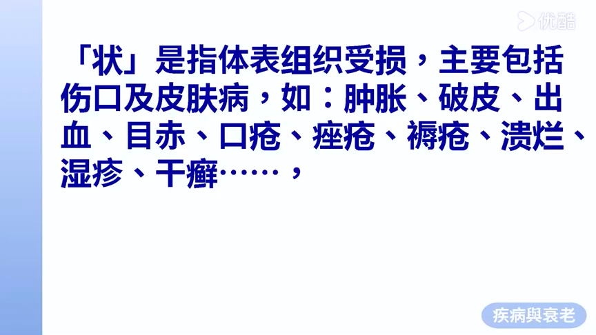 「状」是指体表组织受损,主要包括伤口及皮肤病,如:肿胀、破皮、出血、目赤、口疮、痤疮、褥疮、溃烂、湿疹、干癣……,与西医通过仪器检查出的体内组织受损,如:气胸、骨折、肌腱断裂、脑溢血、胃出血、溃疡、发炎、沾黏……,同属患处体伤所致,差别在于「状」目视即可分辨,不需仪器检查。