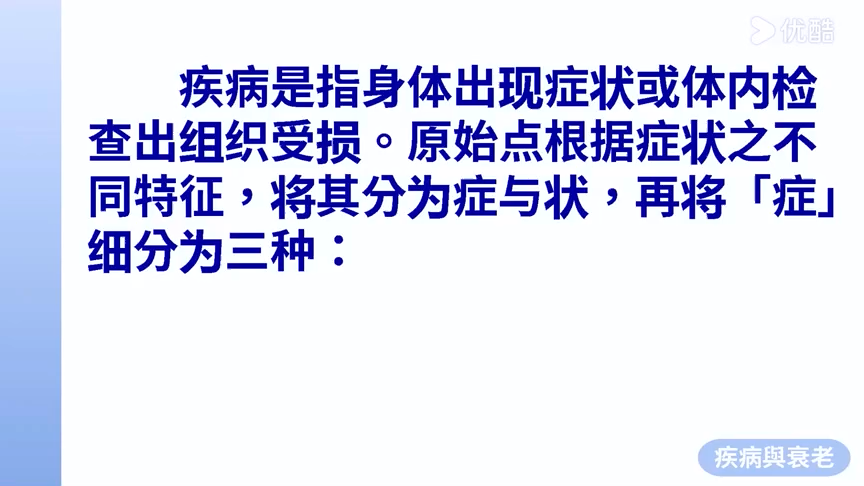 (21:39) 好 这一段 好 我们这现在要谈的就是疾病 刚刚我们说身体有疾病跟衰老 我们这一段开始 先介绍疾病 好 那疾病是指什麽 我刚刚讲的 有症状就是属疾病 没有症状就是属 其它的变化 就属衰老 那疾病 身体出现症状 或体内检查出组织受损 西医检查出来的组织受损也算疾病 所以体表的啊 就是我们观察得到的 还有仪器检查得到的疾病大概就是这样 好 那进一步原始点来讲 这个就是跟中医最大的不一样 原始点开始分类了 原始点根据症状之不同特徵 将其分为症与状 先分出症跟状来 它两个是不同概念 然後症又细分成三种 好 我们来看第一种