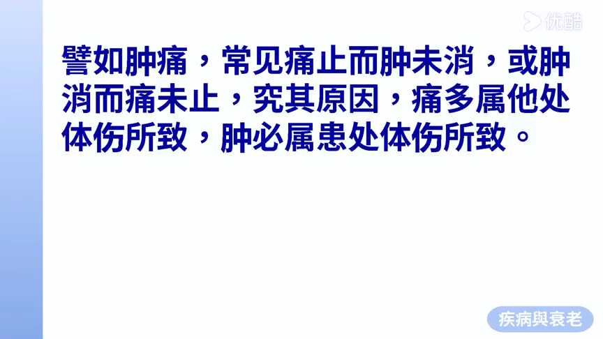 譬如肿痛,常见痛止而肿未消,或肿消而痛未止,究其原因,痛多属他处体伤所致,肿必属患处体伤所致。