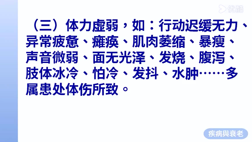 (三) 体力虚弱,如:行动迟缓无力、异常疲惫、瘫痪、肌肉萎缩、暴瘦、声音微弱、面无光泽、发烧、腹泻、