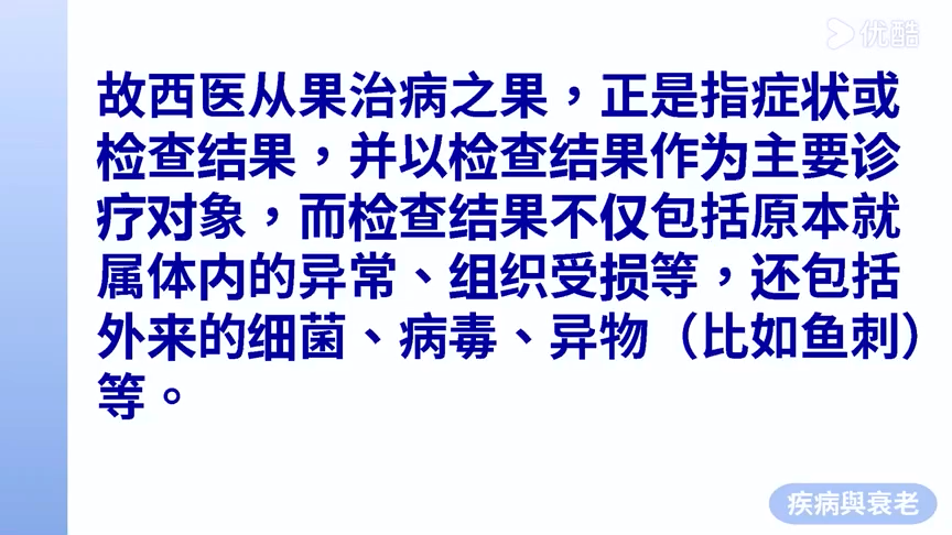 故西医从果治病之果,正是指症状或检查结果,并以检查结果作为主要诊疗对象,而检查结果不仅包括原本就属体内的异常、组织受损等,还包括外来的细菌、病毒、异物(比如鱼刺)等。