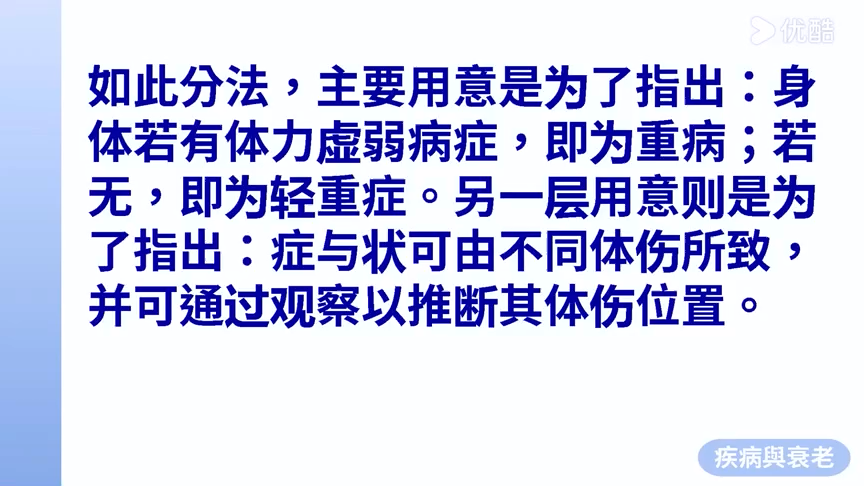 如此分法,主要用意是为了指出:身体若有体力虚弱病症,即为重病;若无,即为轻重症。另一层用意则是为