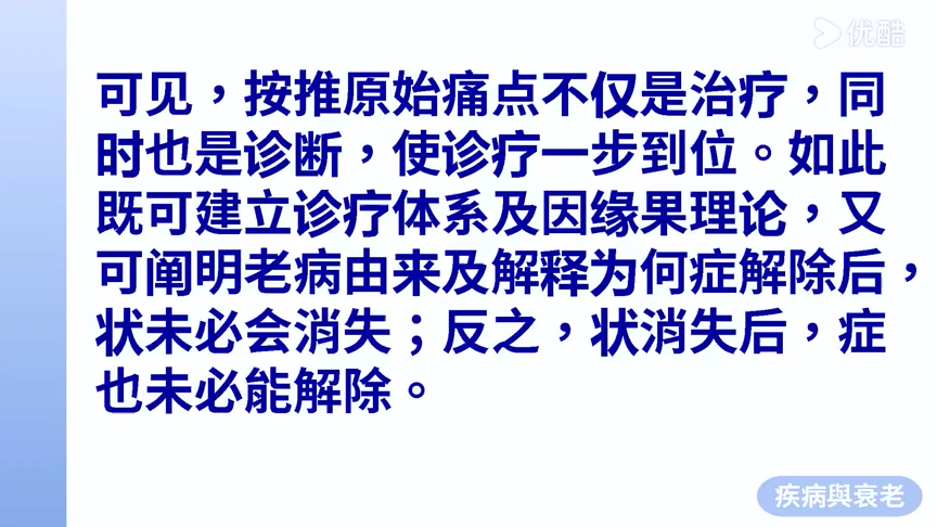 讲解了疾病和衰老的主题,介绍了原始点医学对身体变化的观察和诊断方法,以及如何从症状和体傷位置来判断疾病轻重和治疗方法。