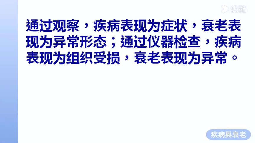 - 通过观察,疾病表现为症状😷,衰老表现为异常形态🧓;通过仪器检查,疾病表现为组织受损🩹,衰老表现为异常📉。