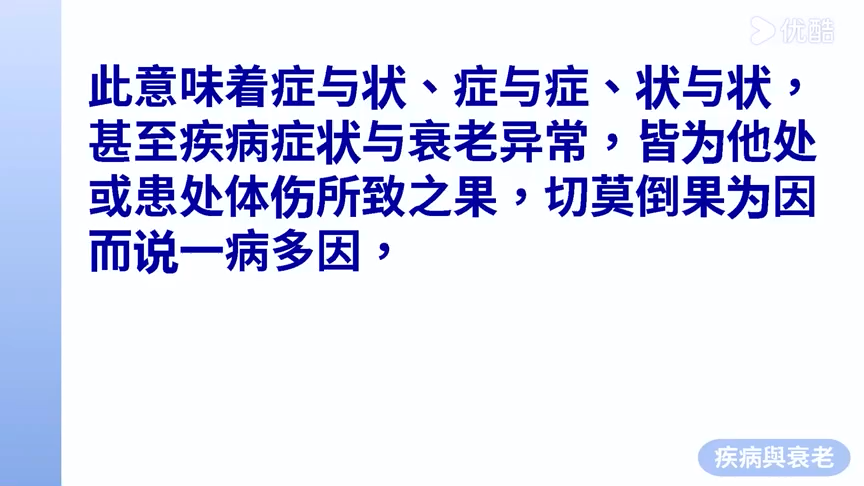 (43:04) 那你们今年很多感染了 应该现在看起来都很老了 但也不会啊 是吧 所以这个逻辑是有问题 这个就是犯的果生果的问题 所以这里就提出一个话 就是既然这些症状 不管是老或病 都是属於果 那你就不应该怎麽样倒果为因 倒果为因就是说什麽 一病多因 你这个病啊 我们看下面 你的疾病是由异常及组织受损所致 譬如说我刚刚讲的头痛 那西医就说啊 我检查出异常的指数 譬如你血压高 所以你那个疾病是由 异常指数所引起 或是你尿酸 然後痛风 然後他就说 哎呀你检查出来那个指数有问题 所以你这个痛风 是由异常引起的 那异常指数是属果还是因 果嘛 那就是倒果为因了 所以这个是不对的