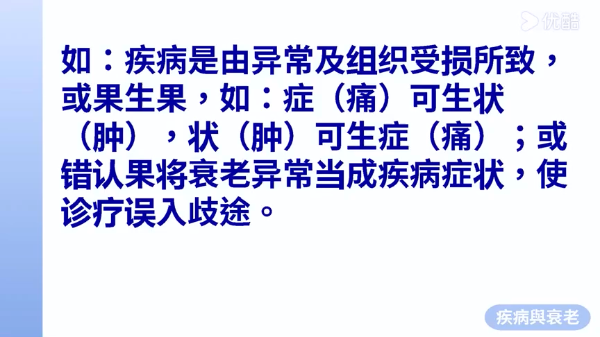 亦即有疾病与衰老必有症状与异常,症状与异常是疾病与衰老之具体表征,而疾病与衰老则是所有症状与异常的抽象代名词,所以分辨疾病与衰老,可观察症状之有无,若有,则为疾病;若无,则为衰老。