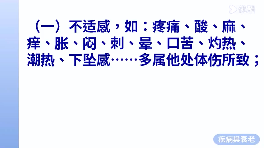 (一) 不适感,如:疼痛😖、酸🍋、麻🌿、痒🐜、胀🎈、闷😶、刺📌、晕🌀、口苦🤢、灼热🔥、潮热🌡️、下坠感🪂……多属他处体伤所致;
