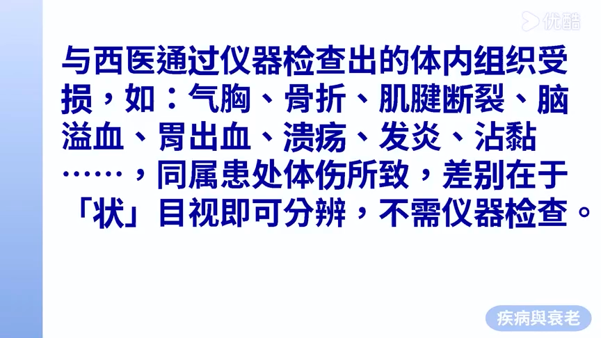 (27:00) 就是让你们可以这样一下子就学会 好那这个到 尤其到水肿 我常常说 不管是肺积水或腹部积水 一般都 我都直接断定为命危 你四肢积水都还没关系 淹到腹部跟肺部来 大概啊要生存机会就越来越小 那这是第三种啊 症的体力虚弱 好我们继续来看状 状大家了解一下 就是皮肤病跟体表的一些伤口 有的没有 这里都有举例 我也不再念 好 再看看西医的组织受损是指什麽 这里也举了几项 包括脑溢血啊 胃出血 肌腱断裂 骨折 这些也不再提了 这些都是属怎麽样 状都是属患处体伤 那目视即可分辨 就是指状 我们体表的 可以看得到