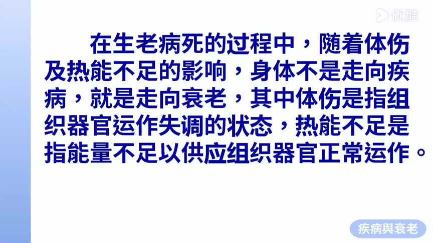 在生老病死的过程中,由于体伤及热能不足的影响,身体不是走向疾病,就是走向衰老。体伤是指组织器官运作失调的状态,而热能不足是指能量不足以供应组织器官正常运作。通过观察,疾病表现为症状,衰老表现为异常形态;通过仪器检查,疾病表现为组织受损,衰老表现为异常。