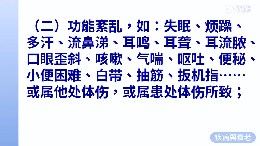 (二) 功能紊乱,如:失眠😴、烦躁😠、多汗💦、流鼻涕🤧、耳鸣👂、耳聋🙉、耳流脓💧、口眼歪斜😵、咳嗽🤒、气喘😤、呕吐🤮、便秘🚫、小便困难🚽、白带🤍、抽筋💢、扳机指🖐️……或属他处体伤,或属患处体伤所致;