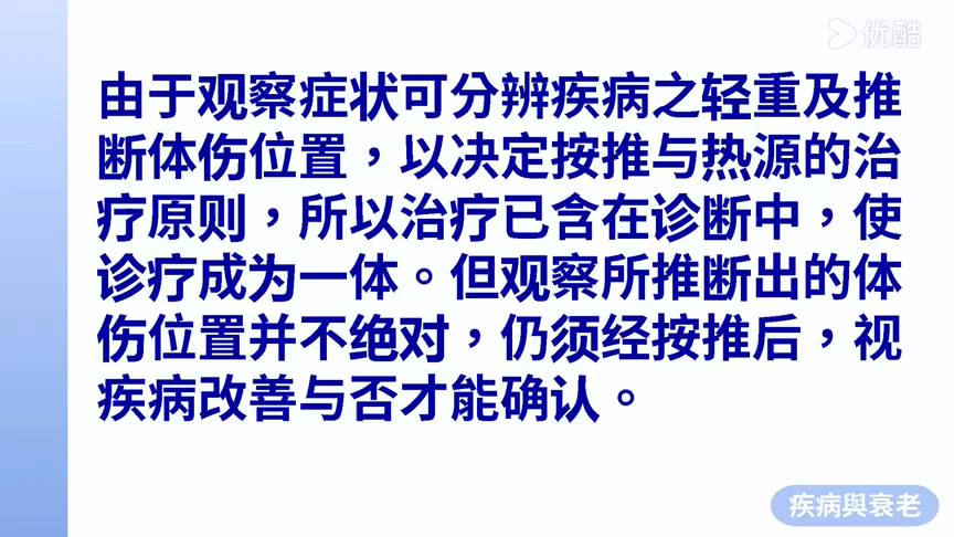 - 如此分法,主要用意是为了指出:身体若有体力虚弱病症,即为重病🏥;若无,即为轻重症🩺。另一层用意则是为了指出:症与状可由不同体伤所致,并可通过观察以推断其体伤位置🧭。 由于观察症状可分辨疾病之轻重及推断体伤位置,以决定按推与热源的治疗原则,所以治疗已含在诊断中,使诊疗成为一体🤝。但观察所推断出的体伤位置并不绝对,仍须经按推后,视疾病改善与否才能确认✅。