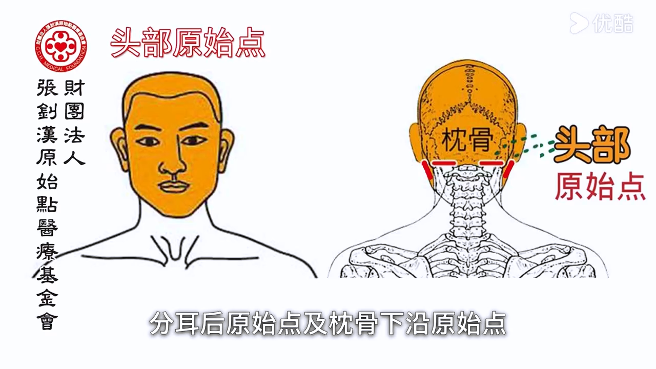 (00:57) 头部原始点 位置如图中红点线所示 分耳後原始点及枕骨下沿原始点 两部分 前者为主 後者为辅 涵盖范围头的全部 如图中橘色区域所示 我们来介绍头部原始点的操作方法 第一个患者 卧姿 但手一定是自然往外垂下来 最轻松的姿势 然後再请患者头部转向 面向你 好 等患者转过来 要看他这个脸 是不是对准着你的两腿 如果这样是最标准 但有些患者会稍微过来 这时候你姿势就要自动调整到这里来 (02:04) 好 那如果他转的是刚好的时候 我们站这里 我们来找 耳後的原始点 第一个手放着 然後拇指把耳垂拨开 以食指指尖去测试 两骨之间贴近耳背 好 这是第一点 第二点 第三点 第四点 我们现在来介绍拳头法 拳头法他一定要握虚拳 然後拇指翘起来 这样才能够 很轻松的按进去 但是不能用握紧的拳头 因为握紧拳头会顶住患者 使他不舒服 (03:08) 所以这个拳头是虚的 有弹性 那我们用拳头法 刚好一次进去就可以按到四个点 手要放轻松 用身体往下沉 就能把拳头带进去 然後像钟摆来回拨动 好这样按完之後 我们再 头转过去 换另外一侧 一样拨开 然後把点找出来 一点 两点 三点 四点 好那我们拳头法 刚好一次下去就可以全部按到 然後握虚拳 靠身体把拳头带进去 不能使用蛮力 (04:15) 然後来回均匀 这就是耳後原始点的按推方法 紧接着头部原始点 除了耳後原始点 还有枕骨下沿的原始点 我们来介绍 枕骨下沿的位置 枕骨下沿的位置 刚好就在耳後原始点後面 乳突骨对过来 然後再来枕骨下沿 交汇处就叫枕骨下沿的起点 沿着枕骨下沿紧贴着骨肉之间 然後延伸到脖子的大脖筋为中点 (05:29) 所以它的位置是这样来的 它的使用工具 是用手肘 手肘然後掌心要向上 这个动作特别要注意的是 下臂与上臂 这个要90度 上臂与这里也要90度 好 工具拿好之後 再来就是要注意姿势 操作者的姿势 如果患者是趴着的时候 那我们用弓箭步 然後重心要蹲低一点 然後手轻触着头部 另外一手拿着工具 (06:39) 直接顶到第一点 这时候90度 以90度 这个不要变形 好 前後开始按推 枕骨下沿 对侧按推完之後 我们再来按同侧的枕骨下沿 你面向我 这时候他同侧对你的时候 你采取的是弓箭步 然後工具一样以手肘