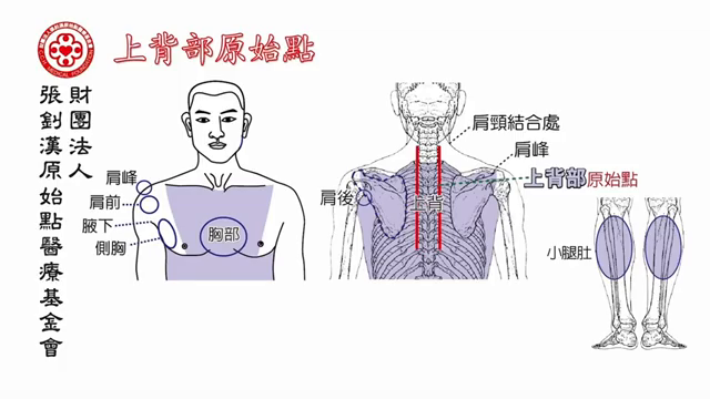 上背部原始点 位置如图中红线所示, 平行,位於脊椎两侧 左右对称。 涵盖范围 上躯干 除锁骨、肩峰、肩膀、肩前、腋下、侧胸以外 及小腿肚 如图中淡紫色区域所示。