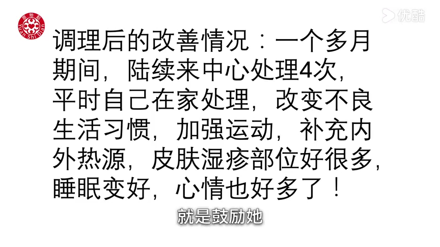 调理后的改善情况:一个多月期间,陆续来中心处理4次,平时自己在家处理,改变不良生活习惯,加强运动,补充内外热源,皮肤湿疹部位好很多,睡眠变好,心情也好多了!