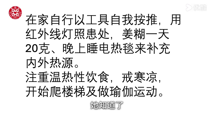 注重温热性饮食,戒寒凉,开始爬楼梯及做瑜伽运动。