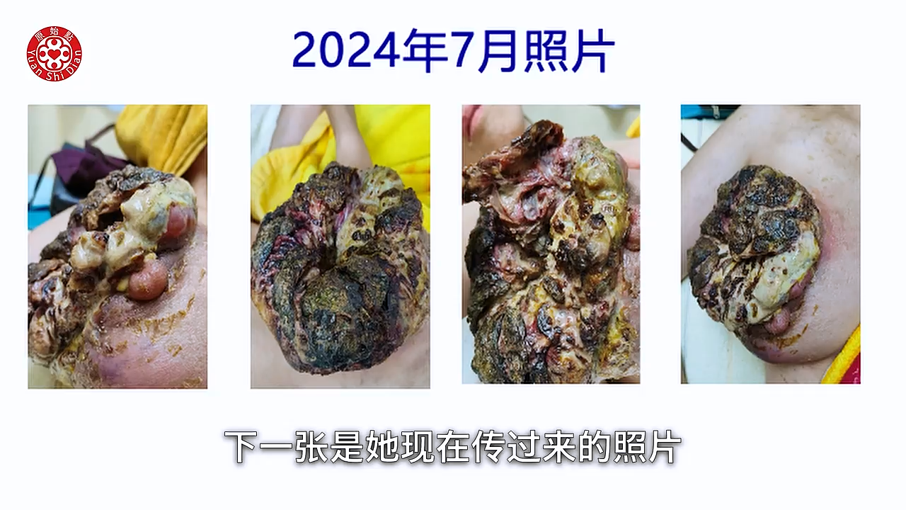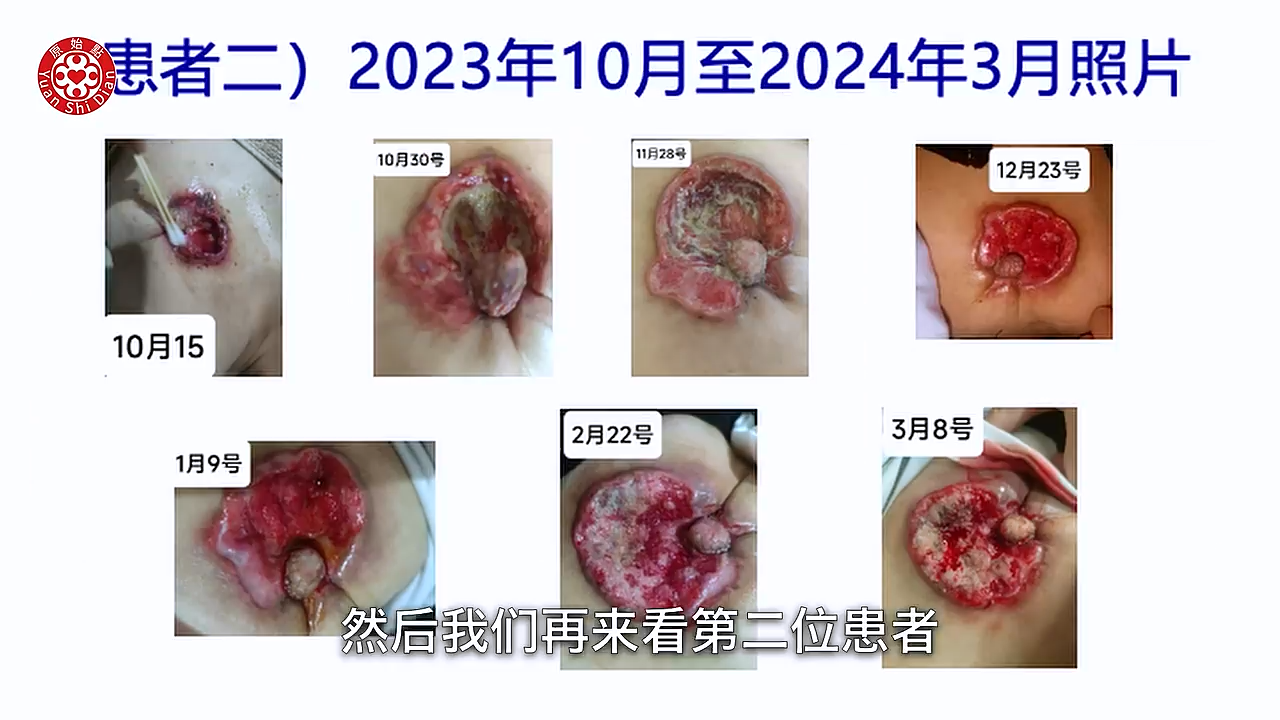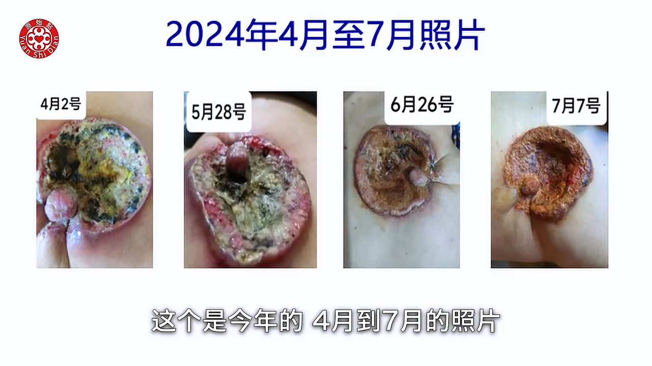 Luna:好谢谢老师 然後第二个的谘询的内容呢是 好几位 老师 好几位乳癌患者 她们大概都是有同样的这些问题 她们说没有用中医或西医的治疗 她们就是 觉得用原始点来做 她们也希望这样子来做 不要有破坏性 所以她们大部分就是自己 尝试着用原始点的手法 然後先生帮太太按推 但是她们 跟我在交流的时候 她们就在讲说 她们胸部有疼痛啊 然後甚至有时候手臂也会水肿 那硬块呢 就会开始变大 然後有创口 然後差不多3-4个月呢 就会开始爆掉 那她们大部分都是在(23:12) 增强内热源的吸收 然後吃姜粉泥 然後我都有问她们 你们在外热源上怎麽做呢 她们都说有敷姜粉泥 所以我听到有敷姜粉泥 那真的就只是涂而已嘛 所以我 我刚好看 就是有几个案例的图片呢 给老师看一下 你看像下一张这个 这一位患者 你看她2024年3月到6月的照片 她3月的时候还没有破的时候 就是这样一个 一小块 然後4月的时候变这样子 5月的时候 然後到第四张是6月 你看这个是第一个患者 下一张是她现在传过来的照片 这是7月的 你看看她7月份就变这样子 你看这麽严重 这麽严重来 才来求助 然後我们再来看第二位患者 下面这个第二位患者也差不多(24:18) 你看她是2023年10月 到2024年的3月 你看10月份的时候 其实它就是一个小小 开始有破口而已 可是到10月底 然後到11月 12月 1月 2月 3月 哇这个 就越来越大 越来越大 然後这麽严重 然後我们看下一张 这个是今年的 4月到7月的照片 老师看 你看她4月份的时候这个溃烂 然後都已经 成这个样子 然後这是5月份 然後6月26号 她大概就是在6月26号左右才 才询问我的 所以那个时候我就告诉她 要看老师的影片 然後怎麽操作 然後开始有涂姜泥 当然是没有几天了 因为今天是7月7号嘛 她传过来的最後这张照片(25:24) 已经有看到比较乾的 因为她知道用吹风机吹了 所以当然只有短短几天 老师 这张照片可以看得很清楚 就是 她的溃烂的那些烂泥都没有了 然後只有短短几天用到 正确的方法 然後根本就不到应该 我忘记了 我发给她的时候不知道是哪一天 也许只有4天到5天吧 那这张7号的照片传过来 我觉得她就已经很乾了