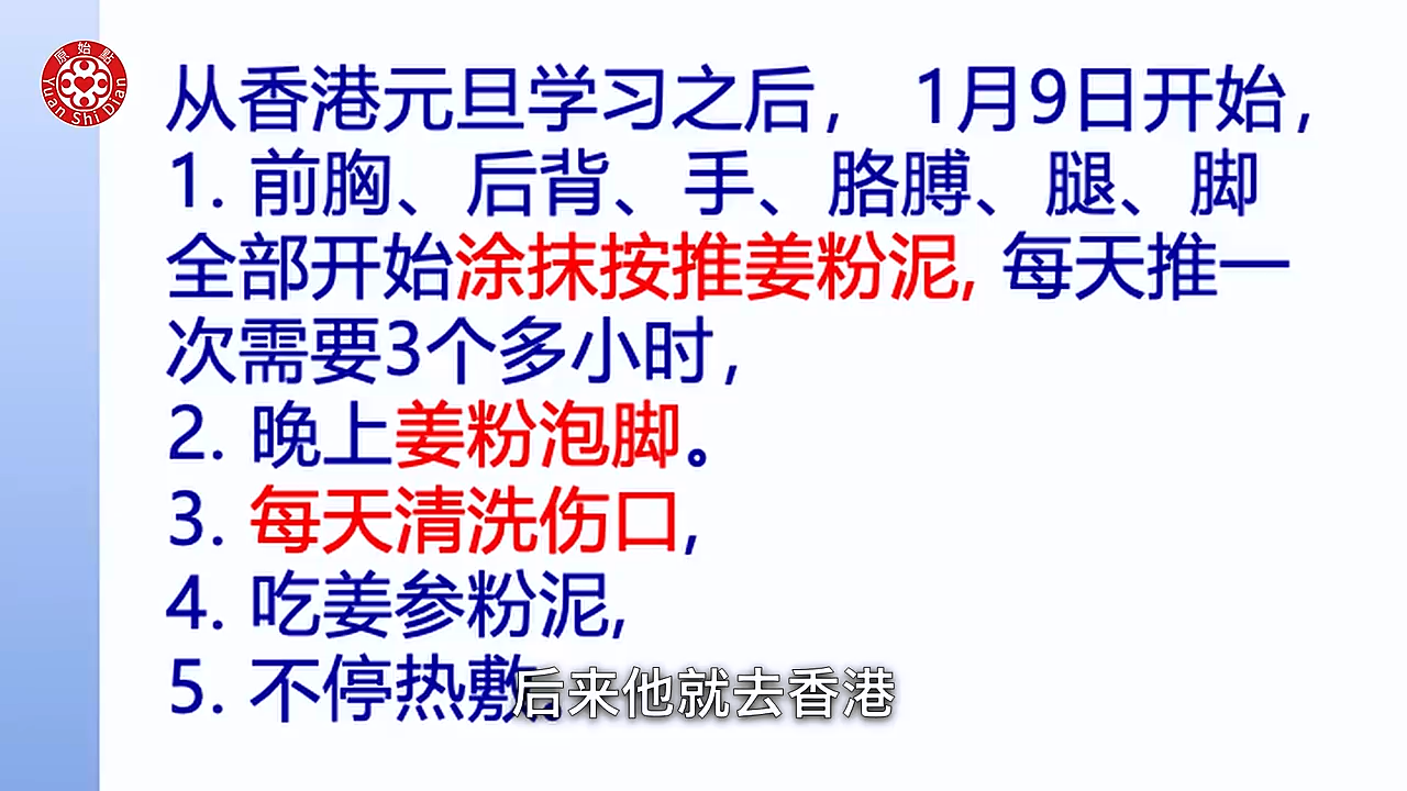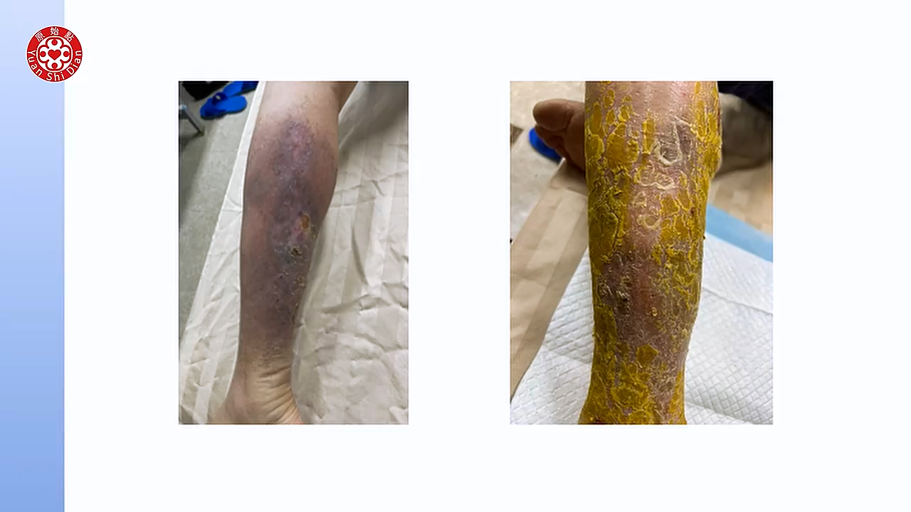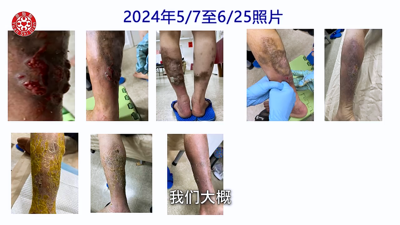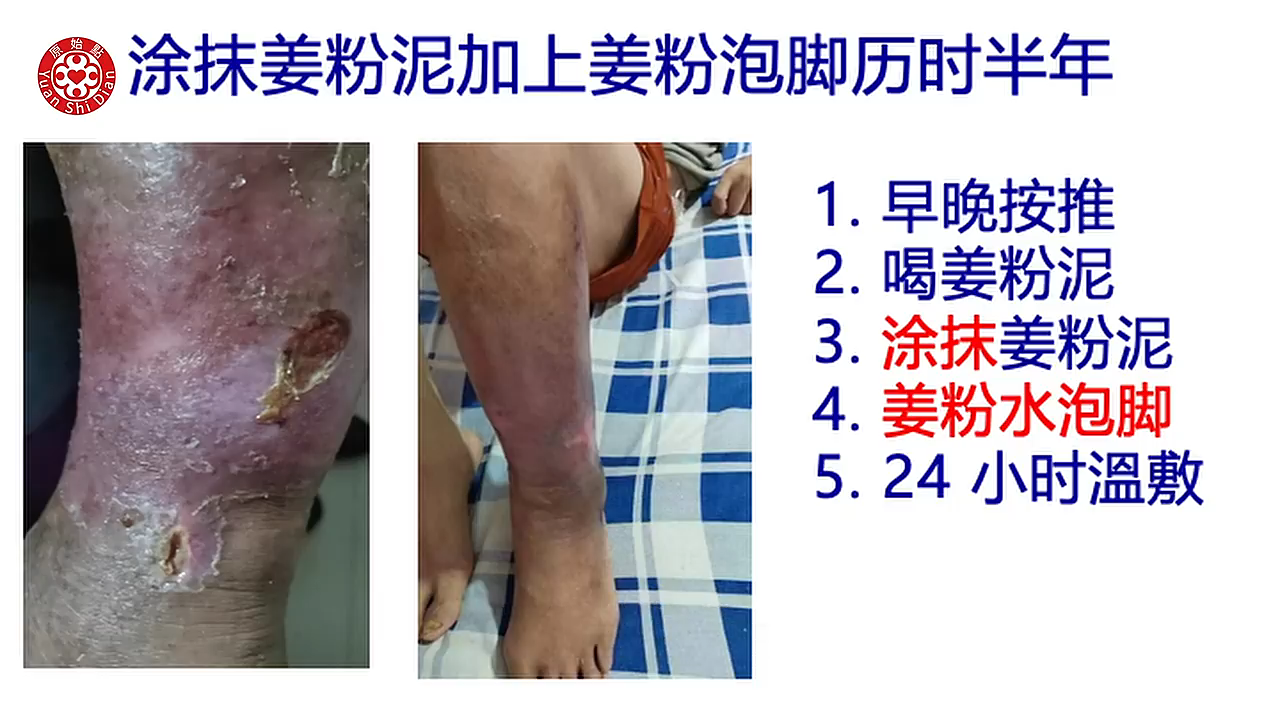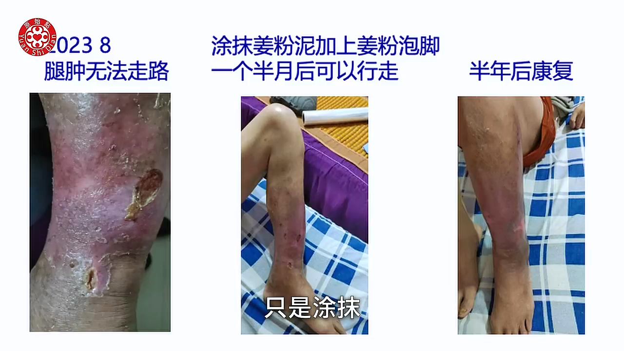 Luna:他当时的腿 是肿 然後又溃烂 他这个是完全没办法走路 瘫痪在床上的 而且医院也是说这个 大概再过一段时间 可能就要面临截肢了 那当时他们是怎麽做呢 刚开始他是用姜粉水来泡 用姜粉水泡脚之後呢 其实我们可以看得到 他是 那个 你看那个洞 那个溃烂了 没有太大的改善 之後呢 我们可以看得到 他开始涂抹姜粉泥 他涂抹姜粉泥 只是涂抹 然後再加上姜粉泡脚 他是一个半月以後 他可以下床走路 (08:02) 我们可以看得到这张 他是没有肿的 没有肿 不过他用 只有涂抹 当然这个是 我们可以看得到 那是2023年8月 所以这个他也还没有去学习 那所以到了半年後 他他才康复嘛 那我们看下面那一张 就是 他涂抹姜粉泥 然後加上姜粉泡脚 大概历时半年 是这样的状况 那他的做法 他早晚有按推 也喝姜粉泥 然後这里呢 我特别标注的就是他是涂抹姜粉泥 就是他只涂上去而已 然後姜粉水泡脚 他就是用姜粉然後泡水 这样泡脚 (09:07) 然後他有24小时温敷 好这个是 合肥 他们做的一个皮肤病的案例
