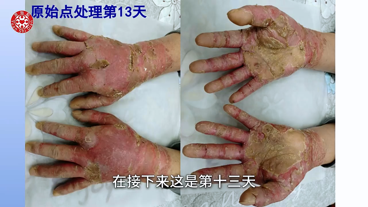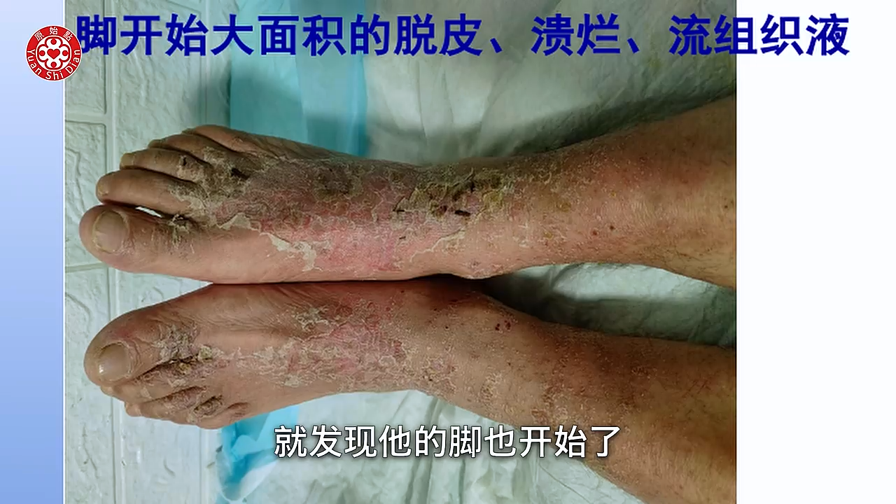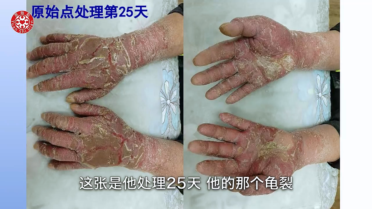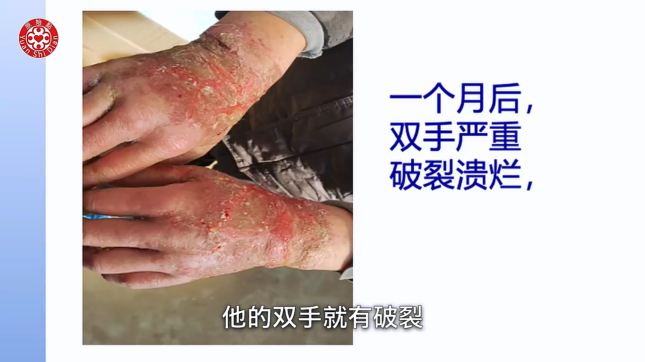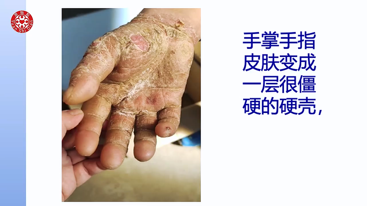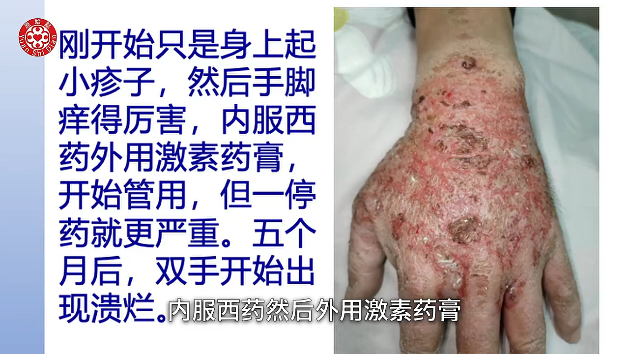 是皮肤病 然後用激素擦了以後 整个过敏溃烂的 刚开始的时候呢 其实只是身上起小疹子 然後手脚痒的厉害 内服西药然後外用激素药膏 开始很管用 但一停药以後就更严重 5个月以後 他双手就开始出现溃烂 一个月以後 他的双手就有破裂 然後也溃烂了 我们可以看得到他的手掌(01:32) 还有他的手指头 都变成一层很僵硬的硬壳在上面