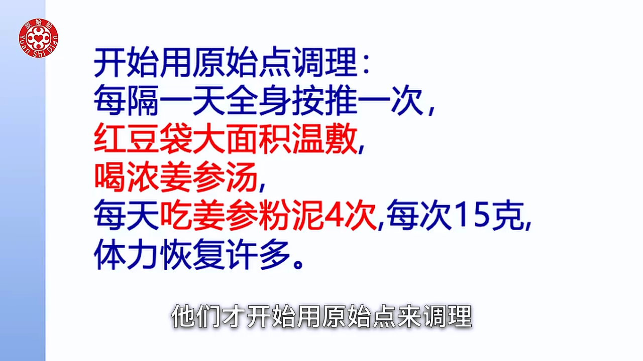 那麽这个时候 他们才开始用原始点来调理 他是每隔一天 全身按推一次 红豆袋呢大面积温敷 然後喝浓姜蔘汤 每天呢也吃姜蔘粉泥4次 每次15克 体力有恢复一些