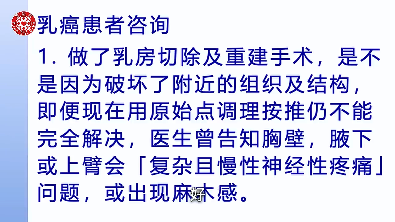 (17:50) 一个呢这个乳癌 有一个乳癌患者 她是这样询问的 不止一个有两三个 她们呢 就是做了乳房切除 重建手术以後 她们认为就是她们现在做了一段时间 有的做半年了 有的做一年了 有的甚至於更长 她们是发现 是不是因为她们做了这些 破坏了她的组织啊 结构 所以即便她们现在在用原始点调理 按推 好像不能完全解决 有时候呢觉得好一点 可是好像那个疼痛 就是依旧会在 那当然有像有一个患者她是跟我说 她说因为医生有跟她讲过 就说以後你的胸壁啦 腋下啦或者上臂 会出现所谓什麽 复杂慢性神经性的疼痛 所以她就想说会不会是这样 那另外有一位呢