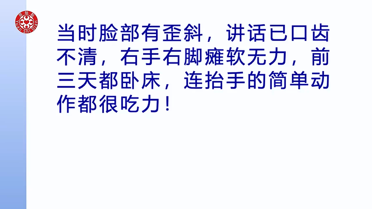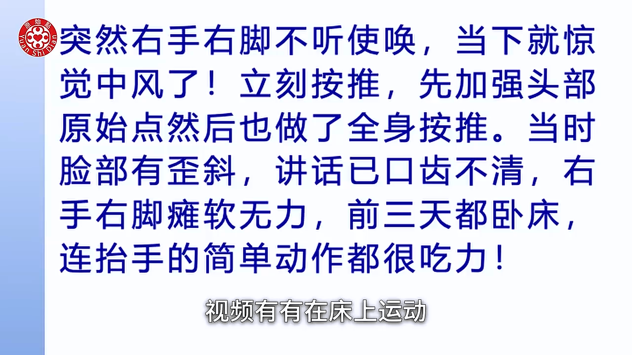 程经理在2020年11月19日突发中风,表现为右手右脚不听使唤、脸部歪斜、口齿不清等症状。通过原始点按推和内外热源的应用,他在短时间内取得了显著的康复效果。