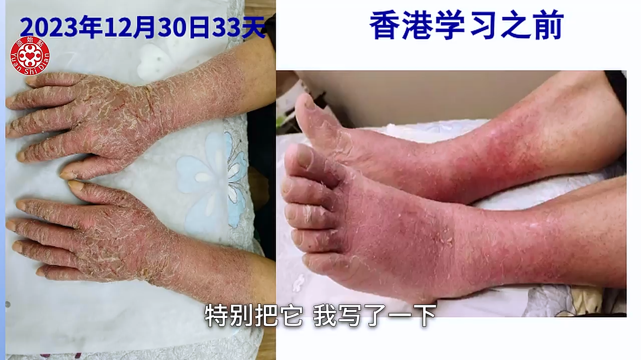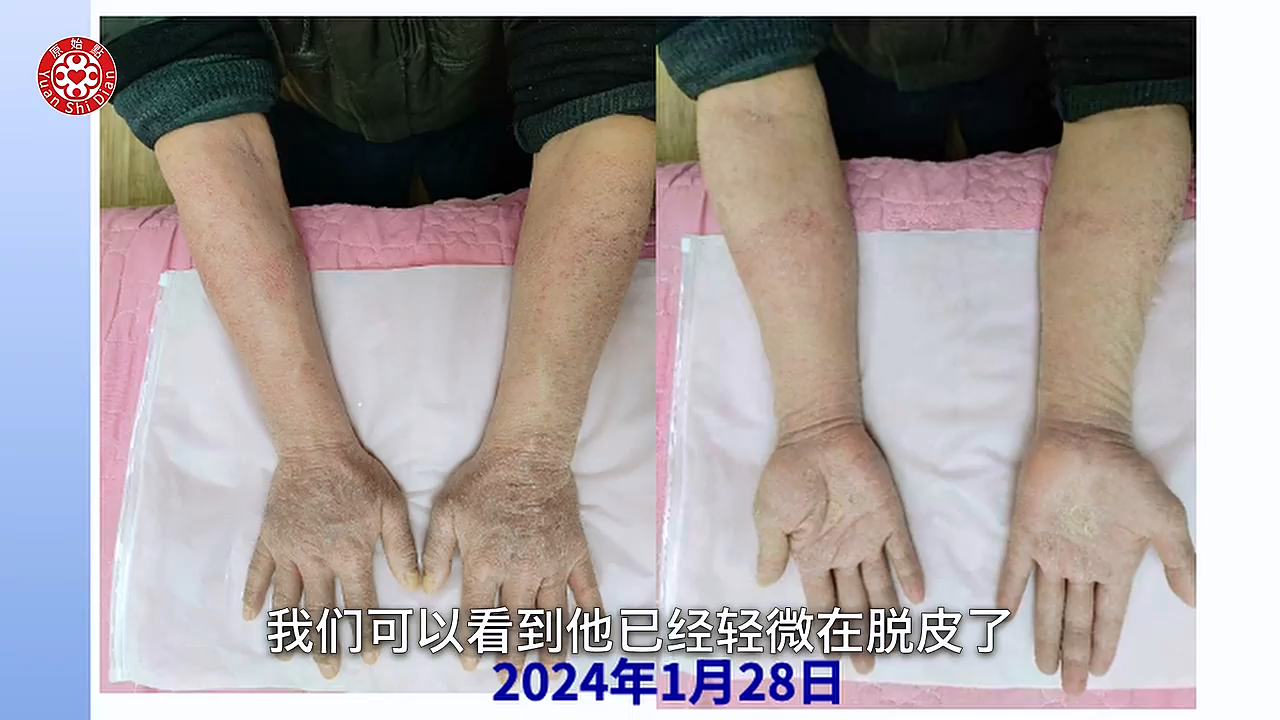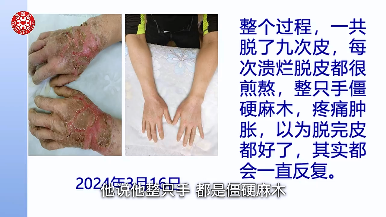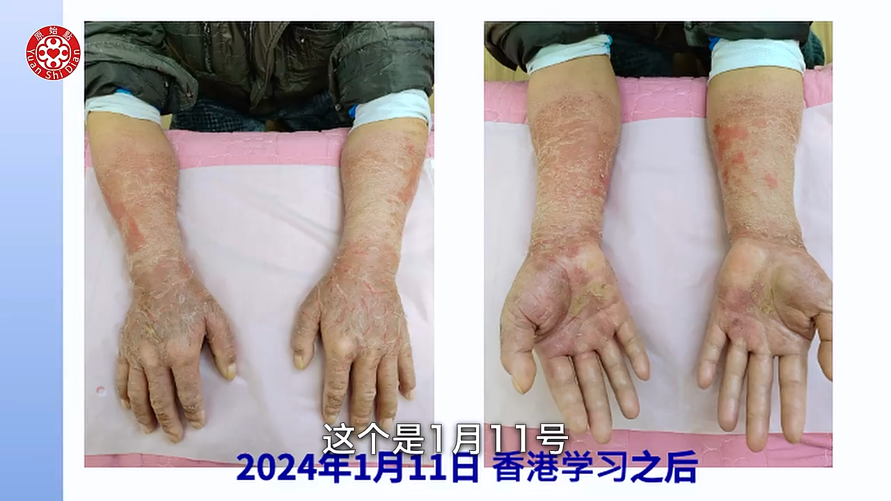 学习以後回到家 就从1月9号 他元旦去嘛 1月9号回到家以後他就开始 他把前胸 後背啊 手啊 胳膊啊 腿跟脚 全部他开始涂抹(04:49) 按推姜粉泥 然後他每天推一次 大概推一次都要三个多小时 晚上呢他又用姜粉泡脚 然後他每天都清洗伤口 那当然他内热原有吃姜蔘粉泥 然後热敷还是没有停 那我们可以看他用新的方法以後 这个是1月11号 大家可以看得到 九号开始做 这是11号 也就是说学习之後的第一次 他拍的照片 可以看得很明显 他的硬皮没有那麽硬了 他的龟裂处也缩小了 那我们再看下一张 好 这张就是1月28号 我们可以看到他已经轻微在脱皮了 那个白白的皮要脱落了 好我们看下一张 下一张这个是他的腿 (05:52) 我们可以看到他写的2月2号 那你看他脚上的那个溃烂 可以看到很明显的好转 而且也没有组织液了 比较乾了 然後我们看他的下一张 非常惊讶 完全康复後的脚跟腿 是这个样子 然後我们看他的手 我们从这一张的比对来看呢 你看他的溃烂 到他现在拍的 3月份拍的这个照片来看 整个过程他大概脱皮九次 然後每次溃烂的时候脱皮 是很煎熬 他说他整只手 都是僵硬麻木 疼痛 肿胀 他以为脱完皮 每次就以为脱皮完了就好了 其实是没有 都是一直在反覆 反反覆覆 这个是 这个案例他他是做的很好 因为他很很清楚(06:56) 这个是河南的 一个皮肤病的这个案例