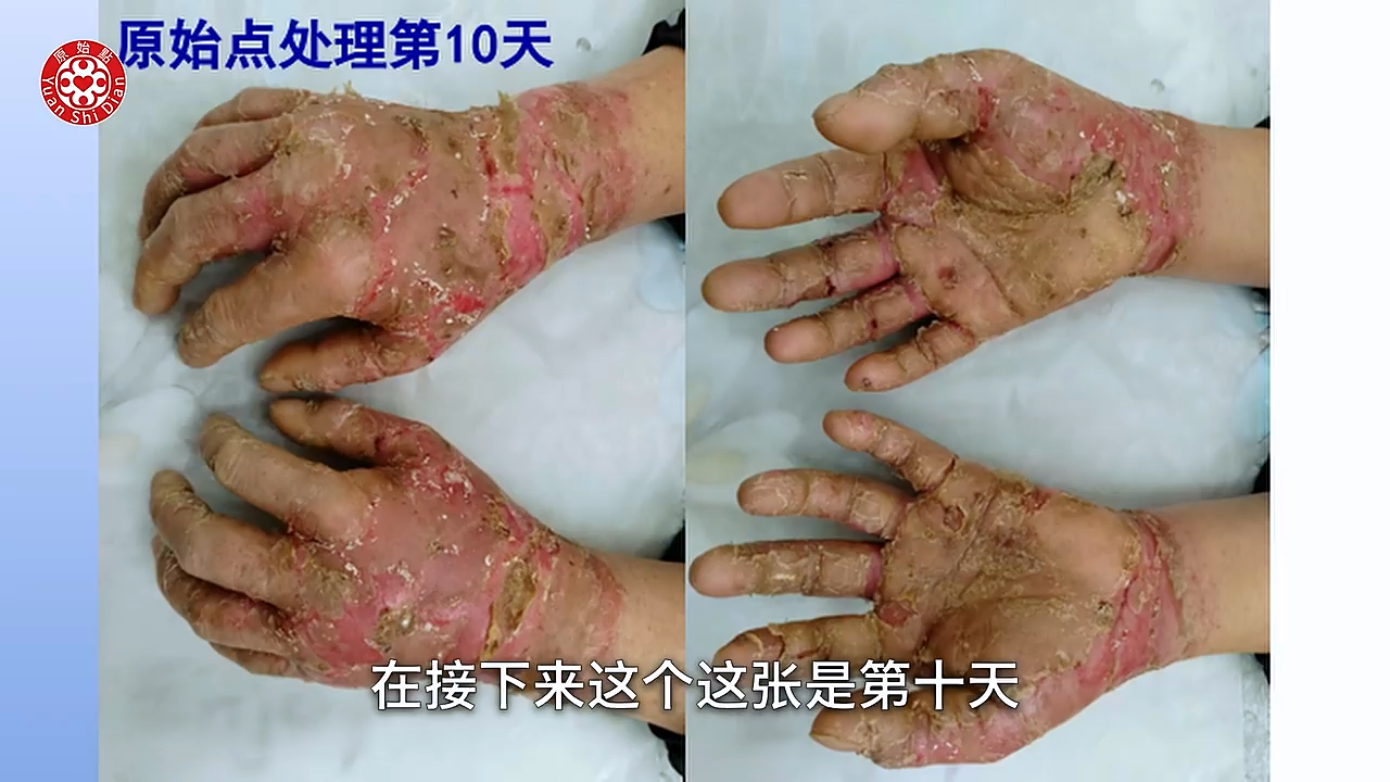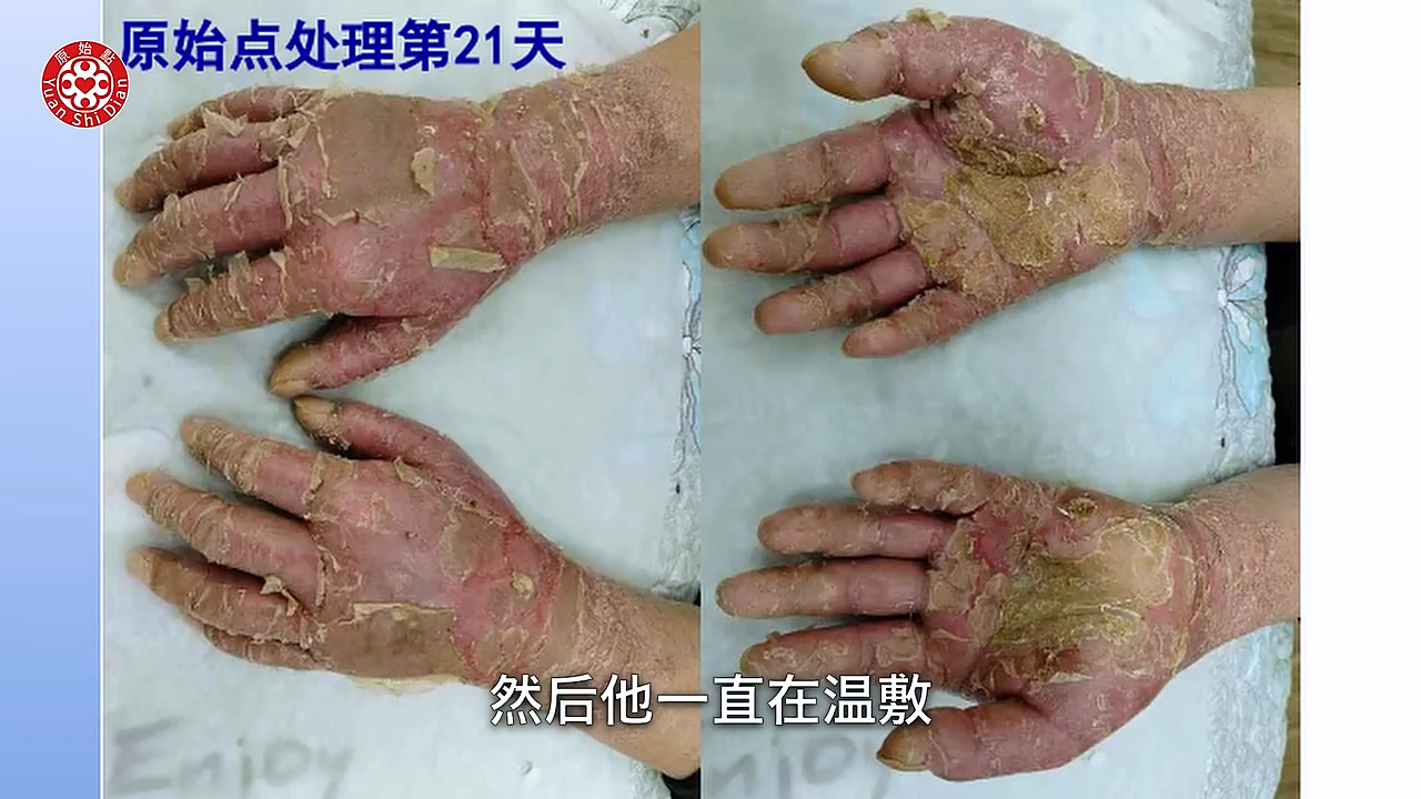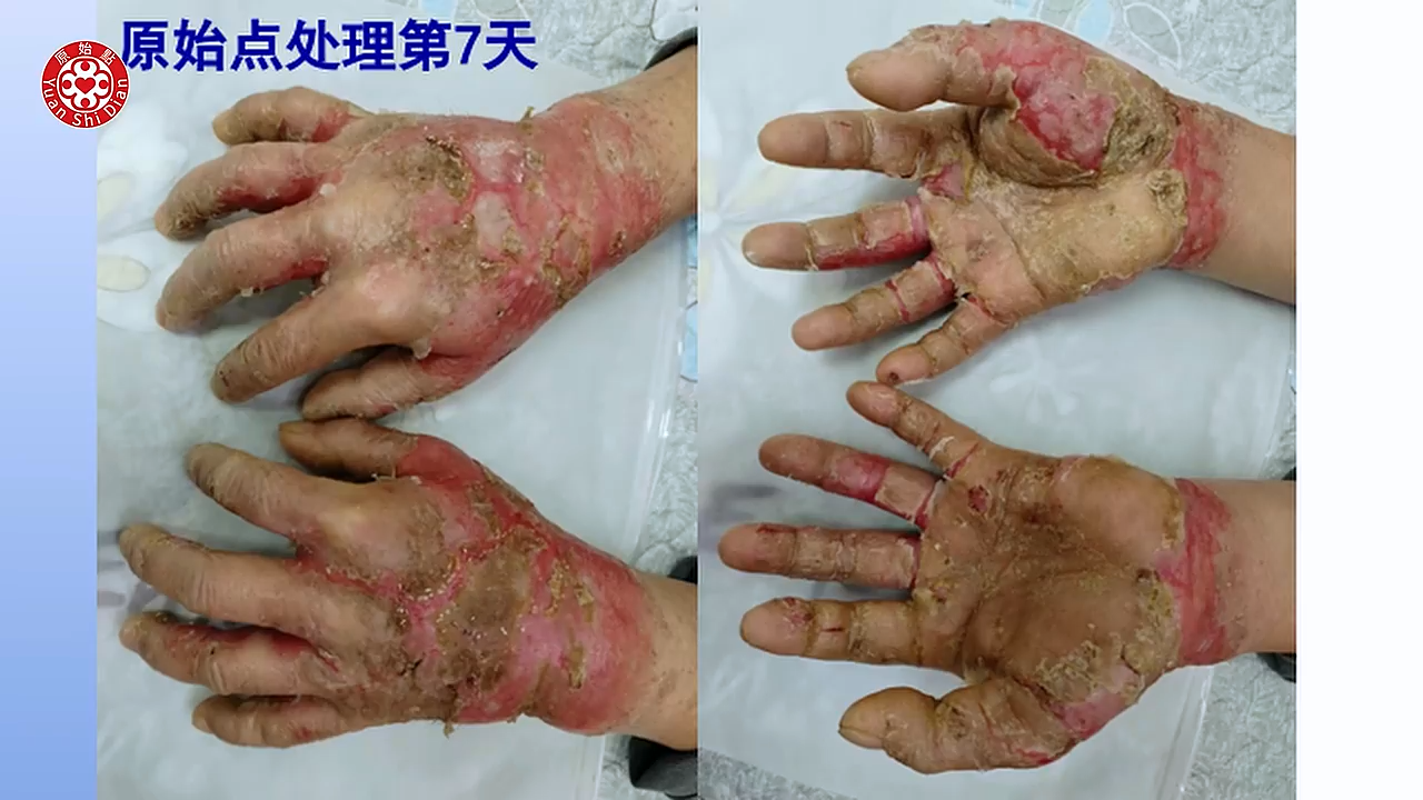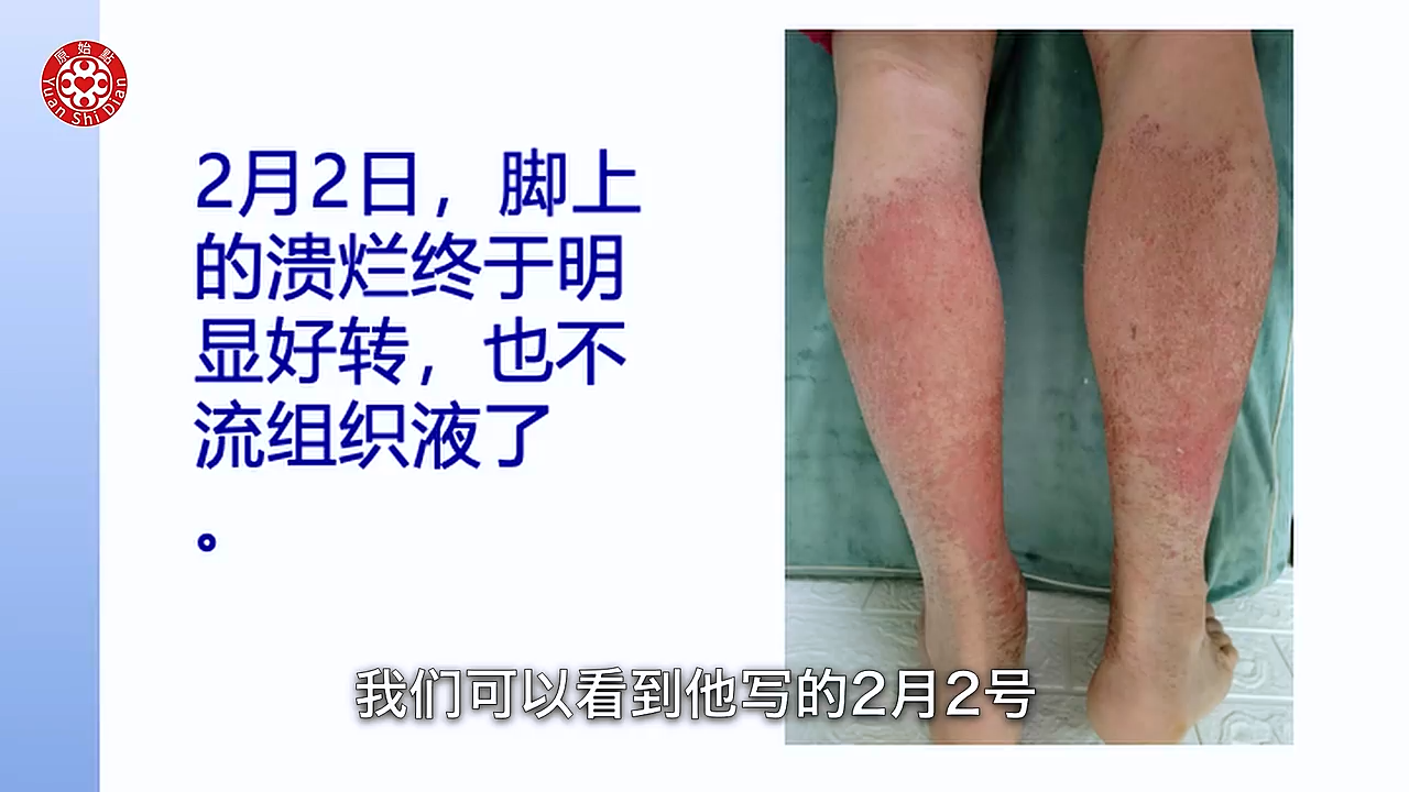 学习以後回到家 就从1月9号 他元旦去嘛 1月9号回到家以後他就开始 他把前胸 後背啊 手啊 胳膊啊 腿跟脚 全部他开始涂抹(04:49) 按推姜粉泥 然後他每天推一次 大概推一次都要三个多小时 晚上呢他又用姜粉泡脚 然後他每天都清洗伤口 那当然他内热原有吃姜蔘粉泥 然後热敷还是没有停 那我们可以看他用新的方法以後 这个是1月11号 大家可以看得到 九号开始做 这是11号 也就是说学习之後的第一次 他拍的照片 可以看得很明显 他的硬皮没有那麽硬了 他的龟裂处也缩小了 那我们再看下一张 好 这张就是1月28号 我们可以看到他已经轻微在脱皮了 那个白白的皮要脱落了 好我们看下一张 下一张这个是他的腿 (05:52) 我们可以看到他写的2月2号 那你看他脚上的那个溃烂 可以看到很明显的好转 而且也没有组织液了 比较乾了 然後我们看他的下一张 非常惊讶 完全康复後的脚跟腿 是这个样子 然後我们看他的手 我们从这一张的比对来看呢 你看他的溃烂 到他现在拍的 3月份拍的这个照片来看 整个过程他大概脱皮九次 然後每次溃烂的时候脱皮 是很煎熬 他说他整只手 都是僵硬麻木 疼痛 肿胀 他以为脱完皮 每次就以为脱皮完了就好了 其实是没有 都是一直在反覆 反反覆覆 这个是 这个案例他他是做的很好 因为他很很清楚(06:56) 这个是河南的 一个皮肤病的这个案例