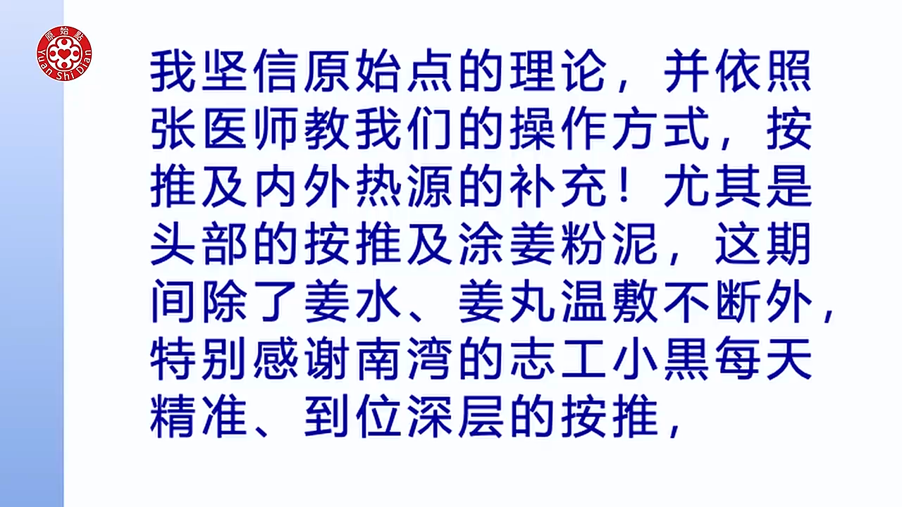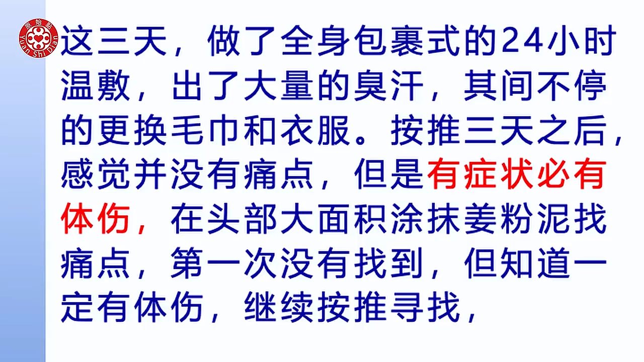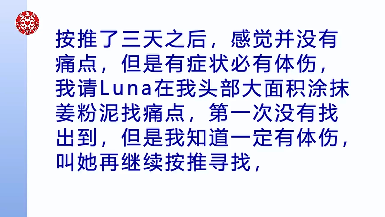 好老师我们 因为当时(48:52) 他右手右脚不听使唤的时候他 他就惊觉到他中风了 那当时我是立刻帮他按推 是先帮他做头部 头部做完以後 我当然也帮他做了全身按推 那个时候他脸部已经有点歪斜 讲话也口齿不清了 右手右脚都瘫软无力 所以前三天其实都是卧床了 就是抬手都 简单动作都很吃力 刚刚那个 视频有有在床上运动 那个视频我们可以看得到 然後大概就这三天 我我觉得这三天我帮他做的 工作就是 现在回想起来就是那三天 是温敷的时候是24小时 但是他是大量的出汗 就是好像一直冒冷汗 然後那个汗也是臭的 期间其实我是一直在跟他换毛巾啊 衣服啊 半夜都一直出汗 (49:56) 那三天之後其实我帮他按推头部 感觉像是没有痛点 可是他还是手脚还是无力嘛 然後 当时程经理就说 不可能 有症状就是一定有体伤 反正他就是叫我一定要帮他找出来 所以那个时候我才 开始帮他涂抹姜粉泥 在头部上涂 那我第一次帮他全部涂完 第一次整个大面积找也没有找到 但是他说不可能 就是知道他他认为一定有体伤 他说我他处应该是按的蛮深层的 还好 应该可以 但是他说我的患处应该要继续找 然後这时候我就在想 我当时找是怎麽找 其实我是用我的大拇指在找 其实找一寸一寸的找 那後来呢 我是在他左侧 偏上的那个位置的深度 涂姜粉泥的时候呢突然间就 就有严重的疼痛感 (51:02) 那他就告诉我说 这个就是就是我的患处的压痛点 他就一直要我在那个患处的位置 叫我加强涂姜泥啊 然後按推啊 就一直在那个位置 连续 我大概那一天就几乎都是在按他的 患处的位置 然後所以到了第四天的晚上 所以我大概有帮他涂了 差不多好几次 那他那天晚上走路的时候 他就发现他的右脚 不会抬不起来 然後也比较有力 然後他的步伐就没有拖地 那种感觉 当时就是他 他指 指说他的内处的那个压痛点 我们来看一下他讲的