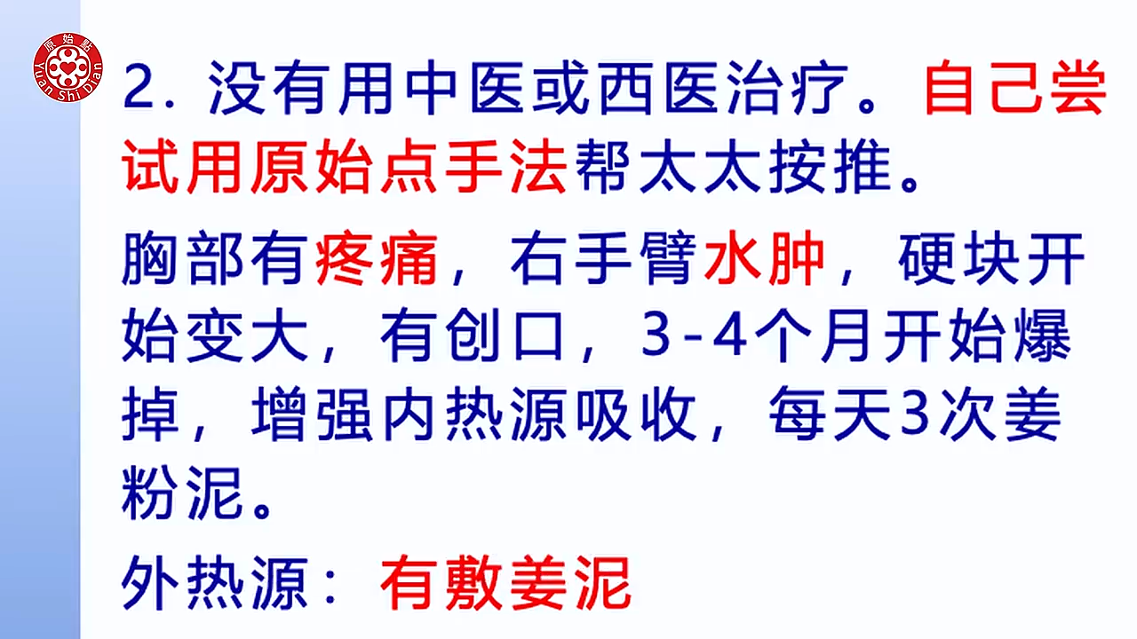 好我们先就原始点的角度来分析 我刚刚已经向 上面那个患者我已经讲了(34:00) 刚开始 有硬结肿块 重手法 一定要找出痛点来按推 那如果爆掉的时候 是不是要去寻求化疗 再手术 类似这样 甚至 就是我重视我的内热源姜粉泥 然後做到极致 然後再来去化疗 ?