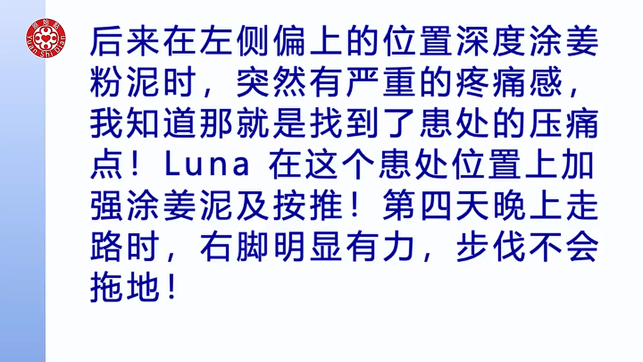 张医师还提到,自2018年以来,原始点方法在患处方面的处理有了更多的研究和实践,通过患处按推和涂抹姜粉泥,也可以达到解症的效果。