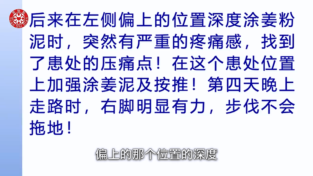 前三天按推他处(头部原始点)无效后,改用姜粉泥大面积涂抹头部,最终在左侧偏上位置找到深层压痛点(患处体伤),通过持续按推+姜泥渗透,4天后右脚力量恢复([文档7]患处处理原则)。