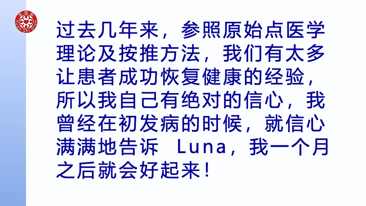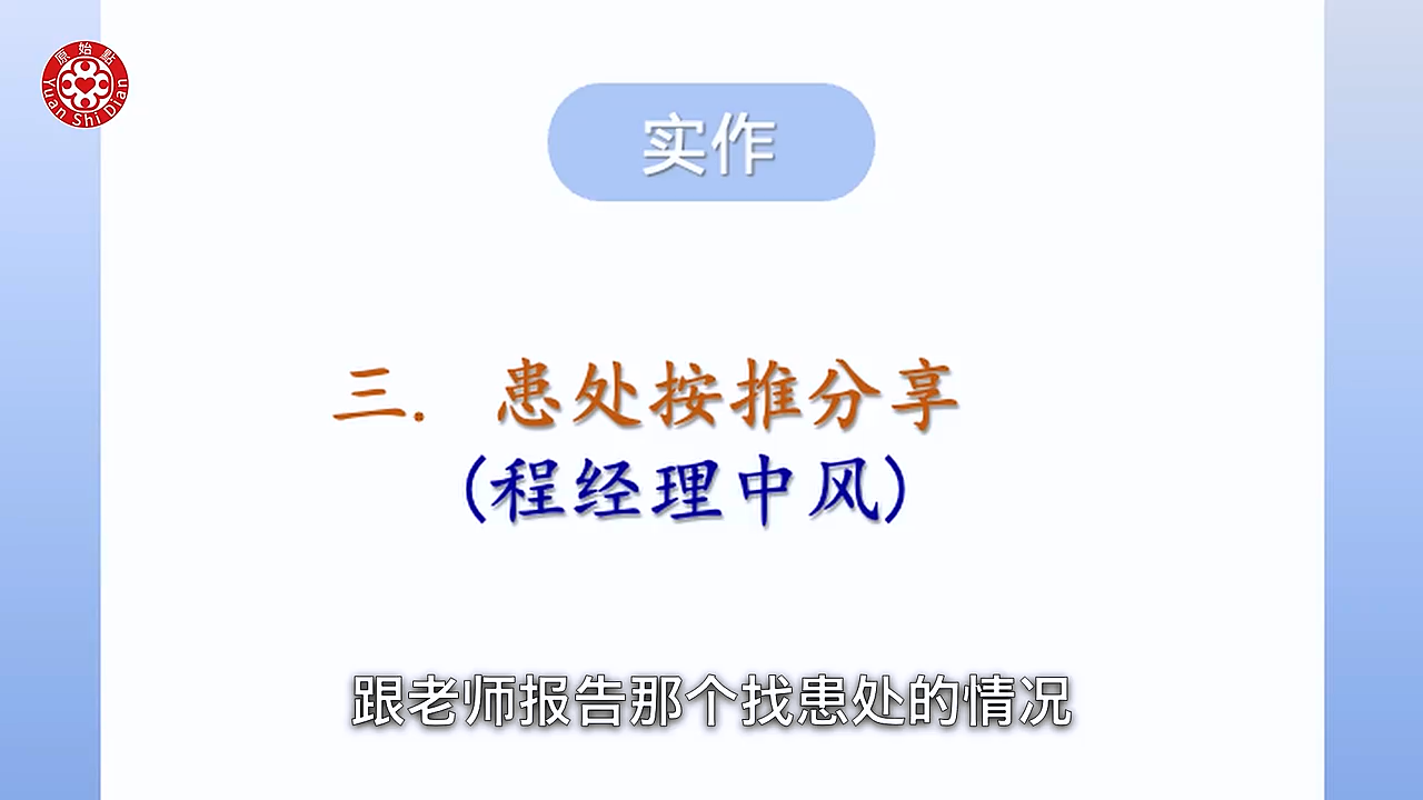 Luna:老师那我们接下来是 老师最近在讲那个患处按推 就是怎麽样在患处找痛点 那老师我分享一下那个 程经理中风的那个影片 因为当时我也在找患处 我先放一段这个影片放完 我再来 跟老师报告那个找患处的情况 那我们先看一下以前的这段影片