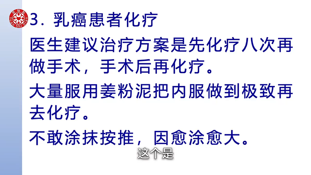 张医师: 是是 所以她第一方面做的不彻底 一直鼓励喝姜粉泥 然後又不能 因为姜粉泥不可能 解除体伤的 解除体伤一定要还要配合 涂抹的技巧或按推的技巧 才有办法把体伤彻底解决 所以她没有 又去鼓励去化疗或手术(40:32) 很可能这些也不能解除体伤 万一又复发了呢 所以我我的担忧是在这里