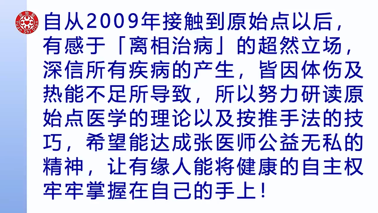 张医师在回答时强调了原始点方法的核心理念,即所有疾病都是由体伤和热能不足引起的。