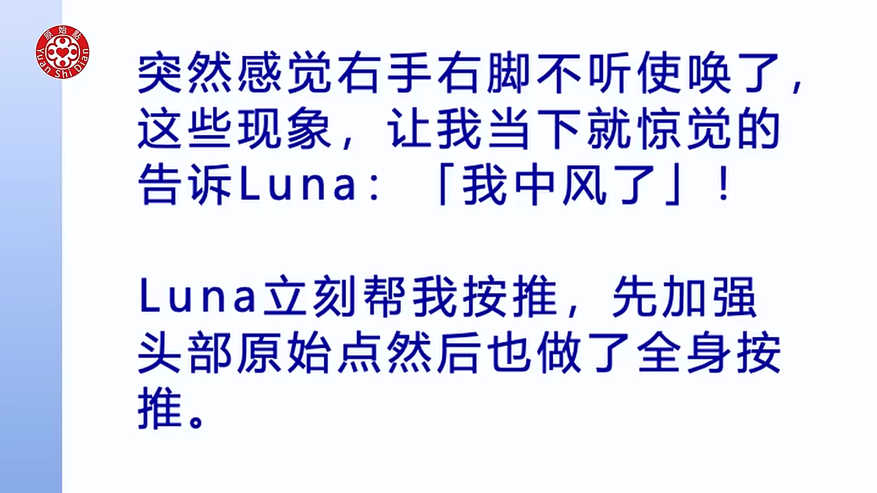 - 程经理在中风初期迅速识别症状,并立即进行原始点按推,特别是头部原始点的按推。