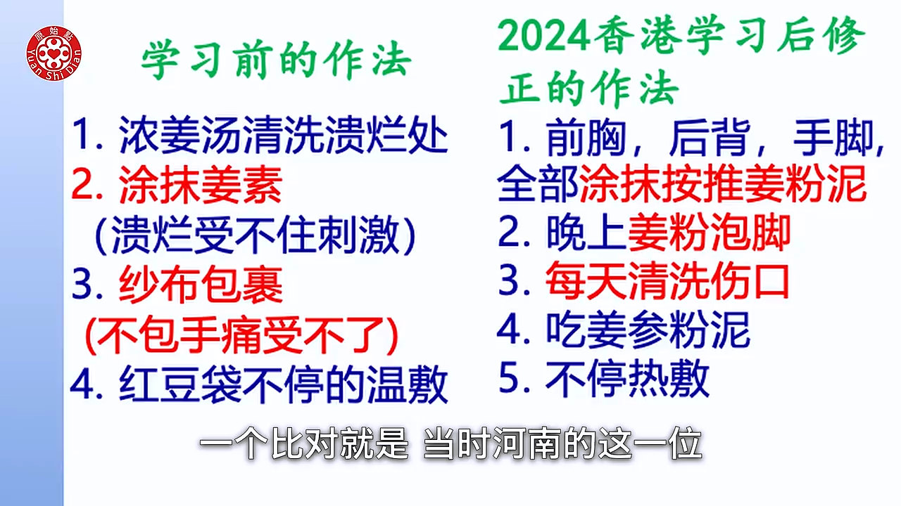 Luna: 所以 我就在看 刚才那个河南的那个案例 他也做的很好 你看他做 虽然他做了三个多月 100多天 但当然之前一大段是在香港 学习之前 那我们来看一下下一张 下一张我就做了一个 一个比对就是 当时河南的这一位 他的案例 他在学习前 他的做法 他是把浓姜汤 清洗溃烂处 还有呢 当然他涂抹的是姜素 然後他又用纱布包裹 那这个是学习前的做法 但是他学习之後呢 他有修正他的做法 (13:32) 他修正是什麽呢 他是涂抹 按推 姜粉泥 然後呢 当然他晚上还是有用姜粉泡脚 再来呢 他还是一样每天有一直在帮他清洗伤口 其他的还没有变