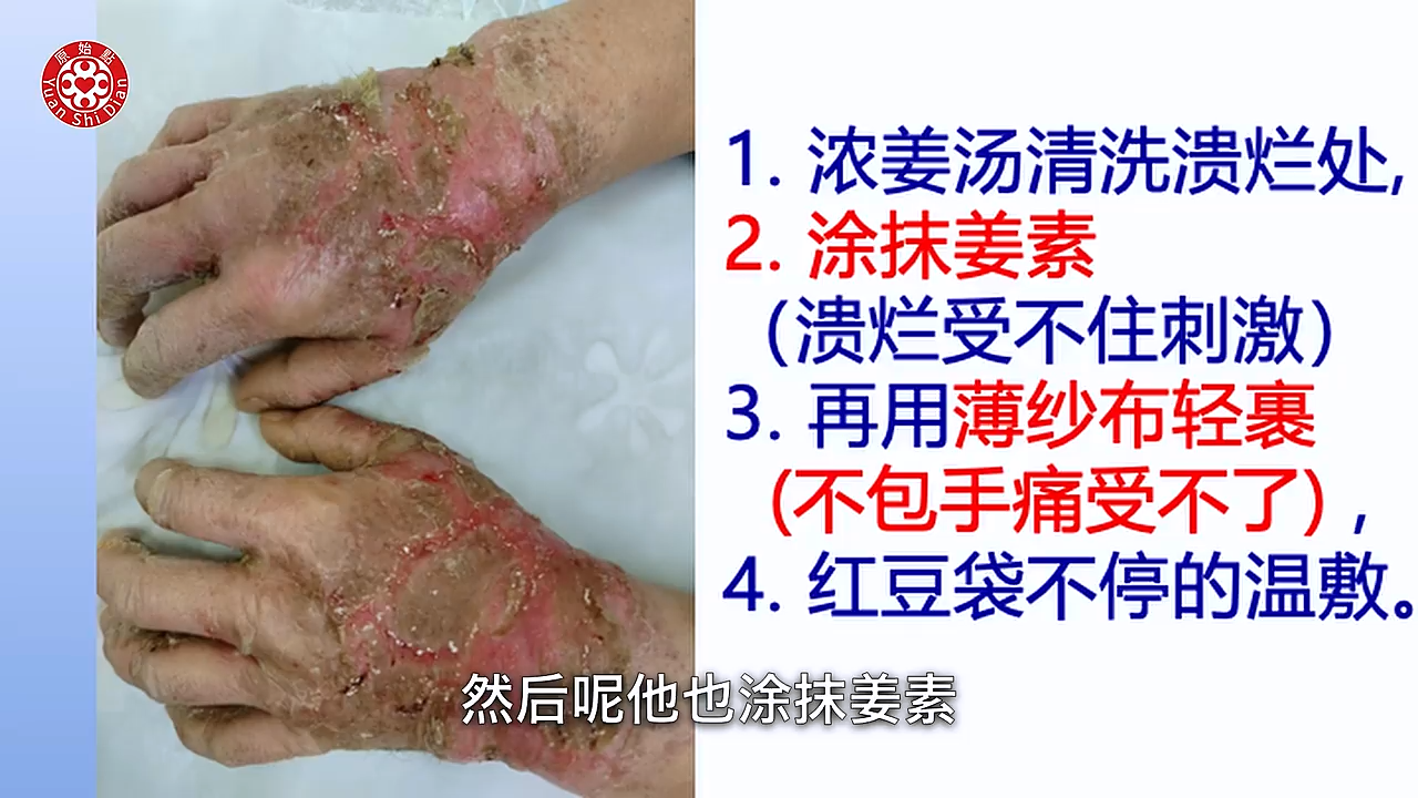 在局部处理方面,患者使用浓姜汤清洗溃烂部位,并涂抹姜素,因为姜泥对溃烂部位刺激过强。同时,使用纱布包裹双手,以减轻疼痛。此外,持续使用红豆袋进行温敷。