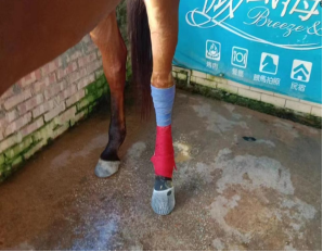 马匹术后一直卧倒在地,我们就喂姜粉,然后用吊车把马匹吊立起来,吊起来后它就慢慢有一点力气了,从此每天我们用姜泥涂抹它的伤口后包扎起来,并贴上暖暖包,通过姜的热能可以有效地促进伤口的加速修复。包扎时候一定要用一点力气、压迫式地包扎,用那个很长的绑腿把它的腿部伤处捆绑起来,以防止再次长肉芽。