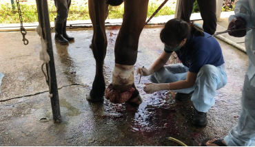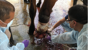 这里是台湾金门乔安马场,2022 年时马场里一匹欧洲进口马的脚部意外受伤,刚受伤时候,用原始点方法帮它温敷,结果肉芽越长越大,长到将近 5 公斤左右,然后在迫不得已的情况下,叫兽医来手术切除,在手术过程中失血太多造成这匹马根本没法站立起来。