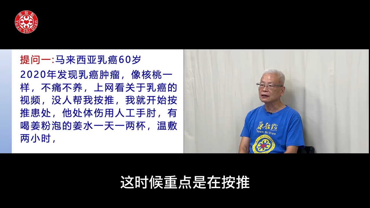 - 患者在2020年发现乳癌肿瘤,开始通过观看视频自学原始点疗法,包括按推患处和他处体伤,饮用姜粉泡的姜水,以及温敷。