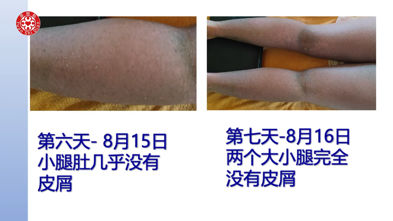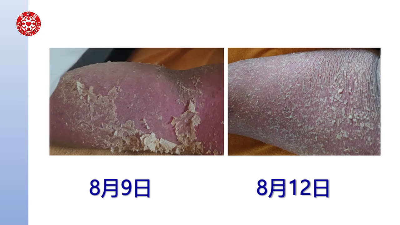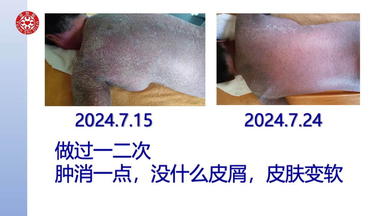 这个患者从症状来看会掉皮屑(12:41),这个应该是牛皮癣或乾癣,又称乾癣。那这个处理方式全身性的,重点你要涂姜粉泥的时候,不是快跟慢的问题,而是那个力道一定要渗透进去。快你没有力道进去,热源也就达不到深层。那像这麽严重,一般体伤都是在深层比较多了。所以在按推的时候,就是靠身体,然後这样用身体顶进去,然後再往往外推,借助那个姜粉泥的嫩滑度。那这样患者一般是能接受。那我的建议是,这样刚刚看整个影片的处理,推不一定要强调速度很快,重点是患者能否承受。