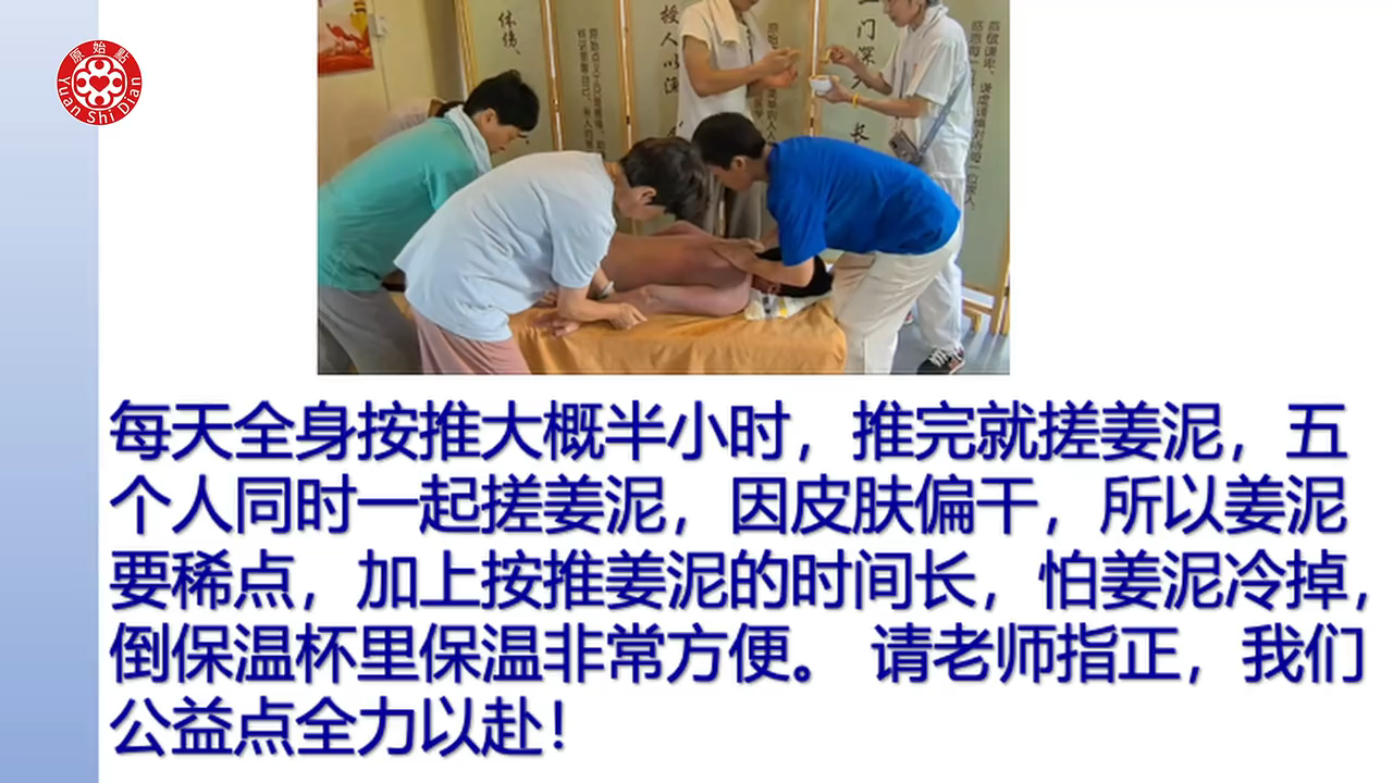 每天全身按推大概半小时,推完就搓姜泥,五个人同时一起搓姜泥,因皮肤偏干,所以姜泥要稀点,加上按推姜泥的时间长,怕姜泥冷掉,倒保温杯里保温非常方便。请老师指正,我们公益点全力以赴!