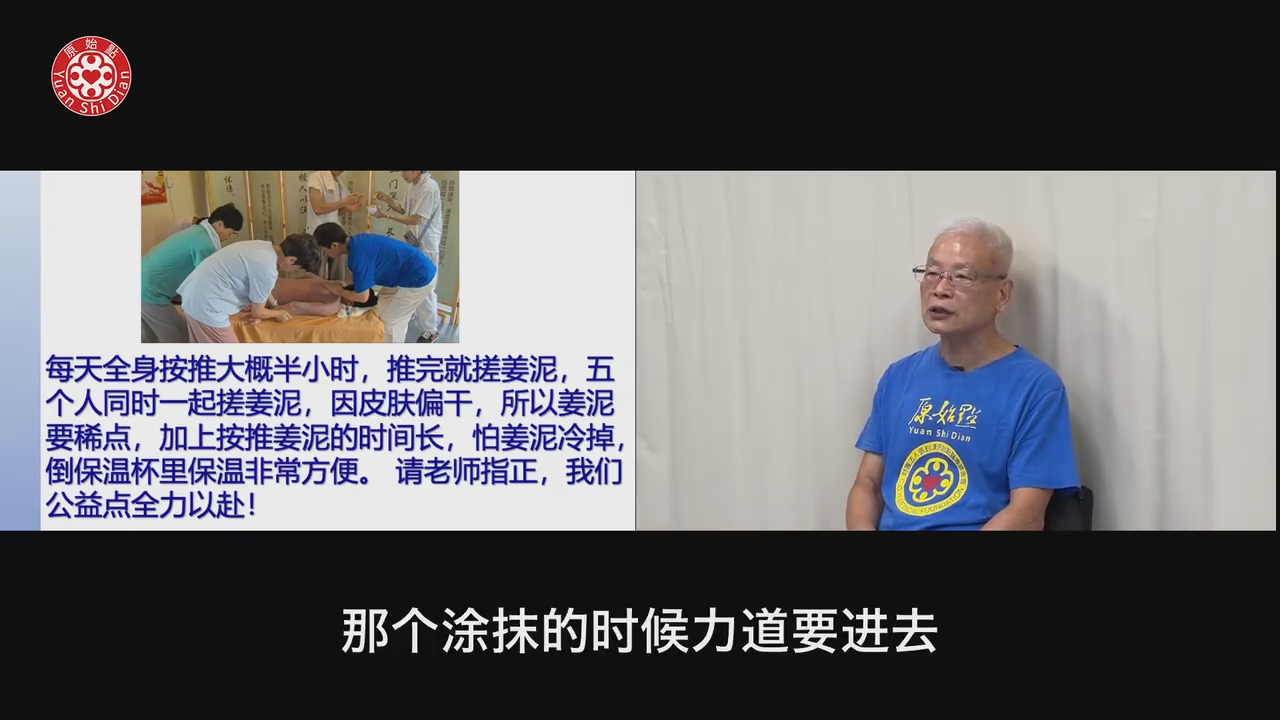 (14:51)那局部的手四肢因为没有展现出,就是在香港培训的那个,就是还是要用手腕腕骨直接顶进去。这一部分我没有看到,倒是背部有,背部整个就有类似我们香港在培训的。那我的建议就是速度不一定要很快,但力道一定要渗透进去。那一般如果一天涂个一个小时,我觉得对患者已经有帮助了。那如果当然他一天回到家,家人又再帮他做一次也可以,一两次都没有问题。那至於四肢的做法一样,原理都一样,只要涂就是那个涂抹的时候力道要进去。我特别强调力道要进去,不要在表层这样涂。那至於姜粉泥要不要很稀,因为他乾癣。