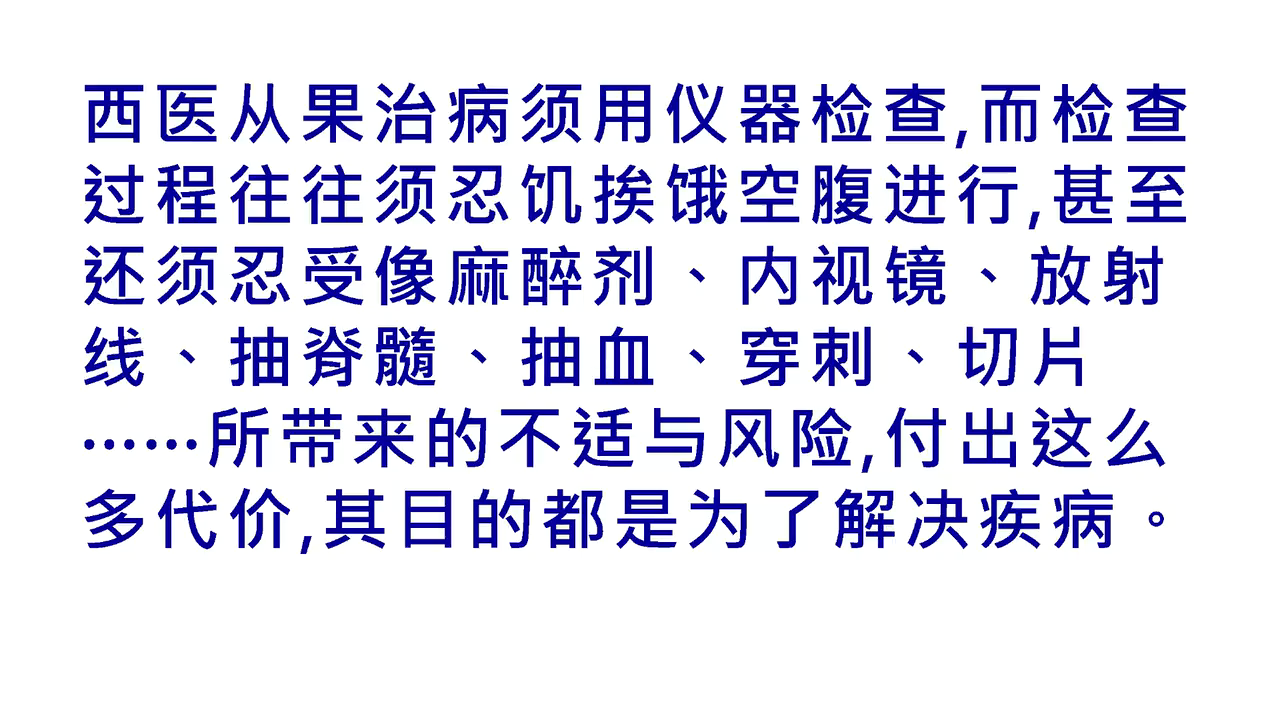 西医从果治病需用仪器检查,而检查过程往往需忍饥挨饿,空腹进行,甚至还需忍受像麻醉剂、内视镜、放射线、抽脊髓、抽血、穿刺切片所带来的不适与风险。付出这么多代价,其目的都是为了解决疾病。换言之,西医是以仪器检查出来的异常及组织受损作为主要诊疗对象,亦即身体有病,则将其当成疾病之一;无病,则将其当成疾病本身而加以治疗。殊不知,检查出来的异常及组织受损皆由体伤及热能不足所致,所以是果而非因。