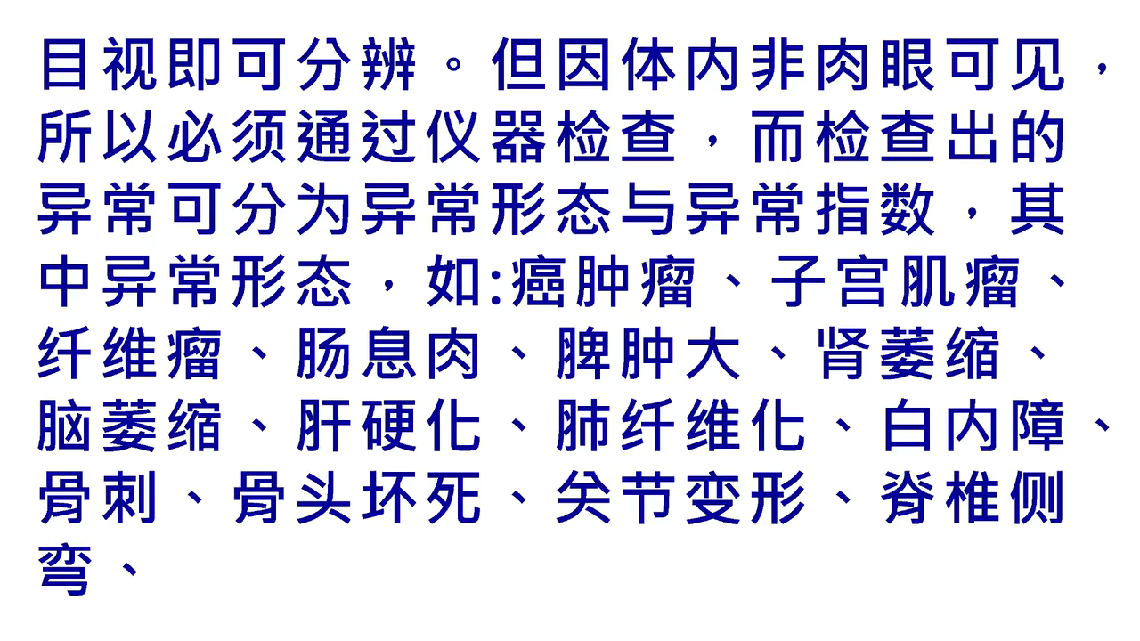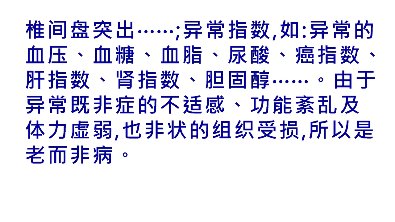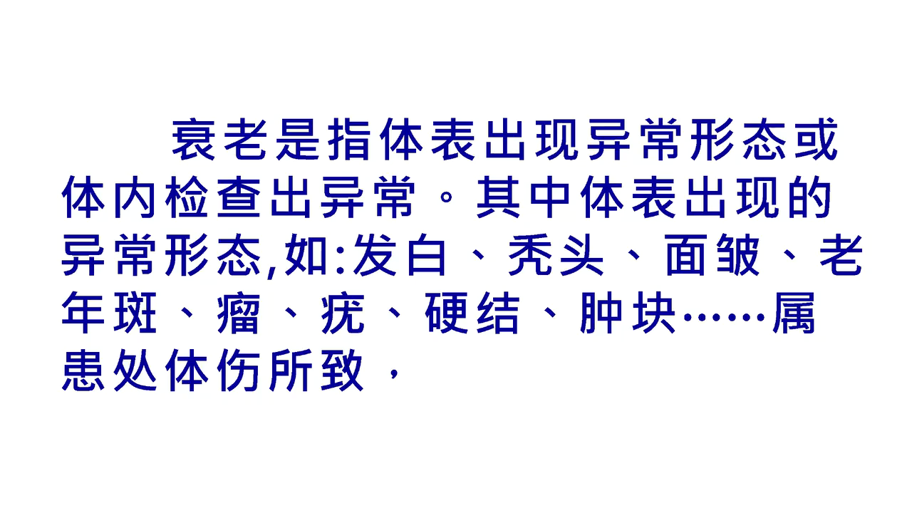 衰老是指体表出现异常形态或体内检查出异常。其中体表出现的异常形态,如:发白、秃头、面皱、老年斑、瘤、疣、硬结、 肿块⋯⋯属患处体伤所致,目视即可分辨。但因体内非肉眼可见,所以必须通过仪器检查,而检查出的异常可分为异常形态与异常指数,其中异常形态,如:癌肿瘤、子宫肌瘤、纤维瘤、肠息肉、 脾肿大、肾萎缩、脑萎缩、肝硬化、肺纤维化、白内障、骨刺、 骨头坏死、关节变形、脊椎侧弯、椎间盘突出⋯⋯;异常指数, 如:异常的血压、血糖、血脂、尿酸、癌指数、肝指数、肾指数、 胆固醇⋯⋯。由于异常既非症的不适感、功能紊乱及体力虚弱, 也非状的组织受损,所以是老而非病。