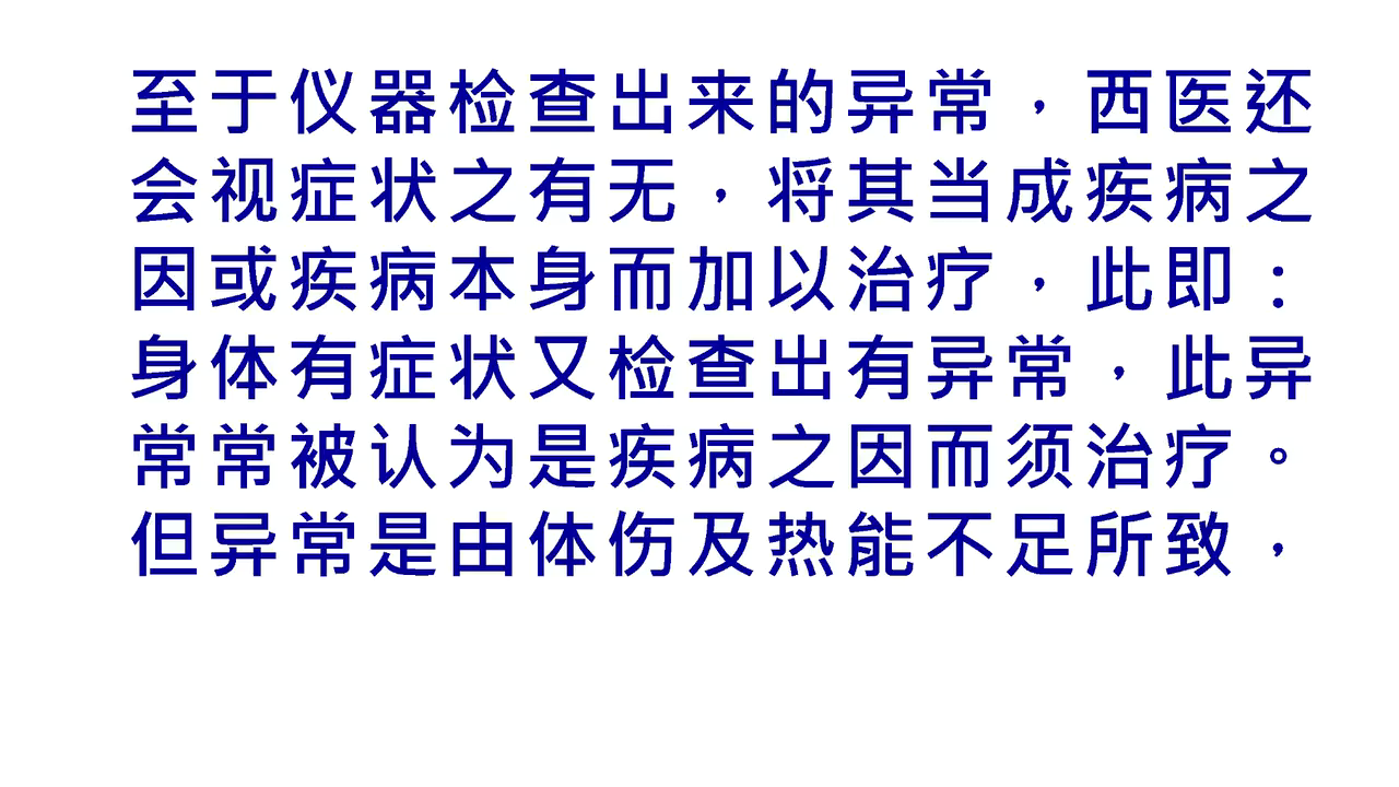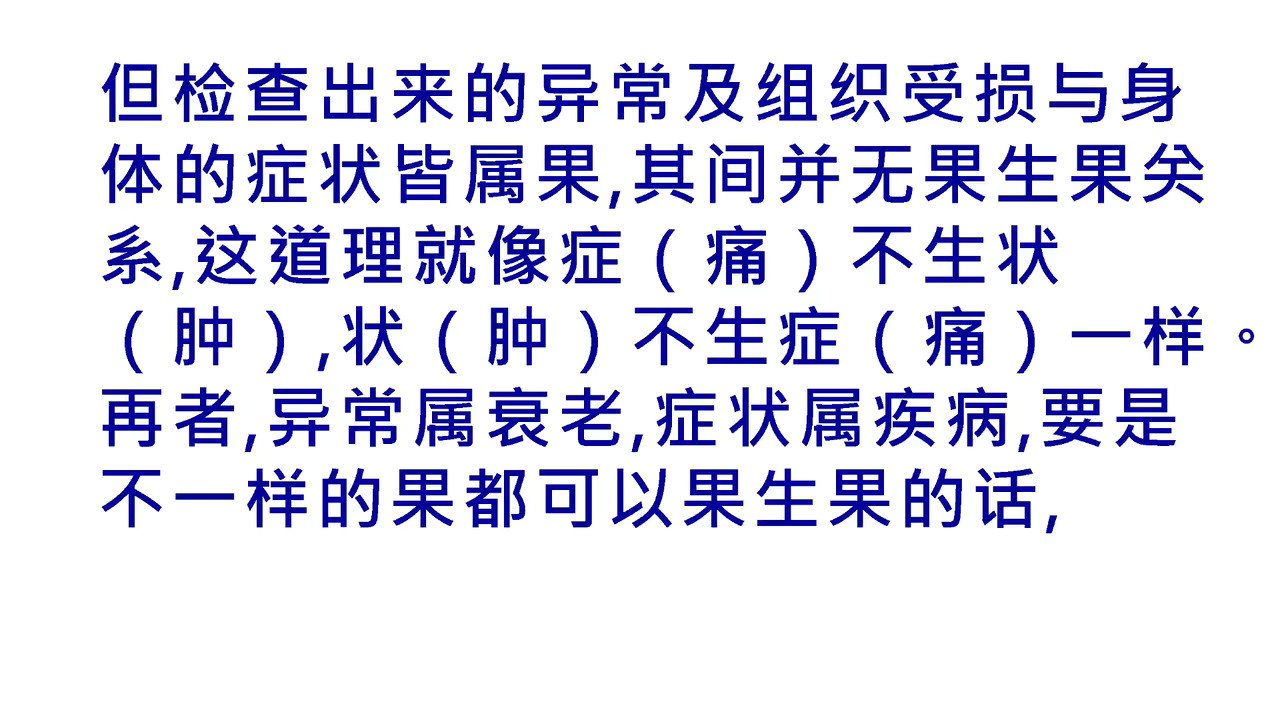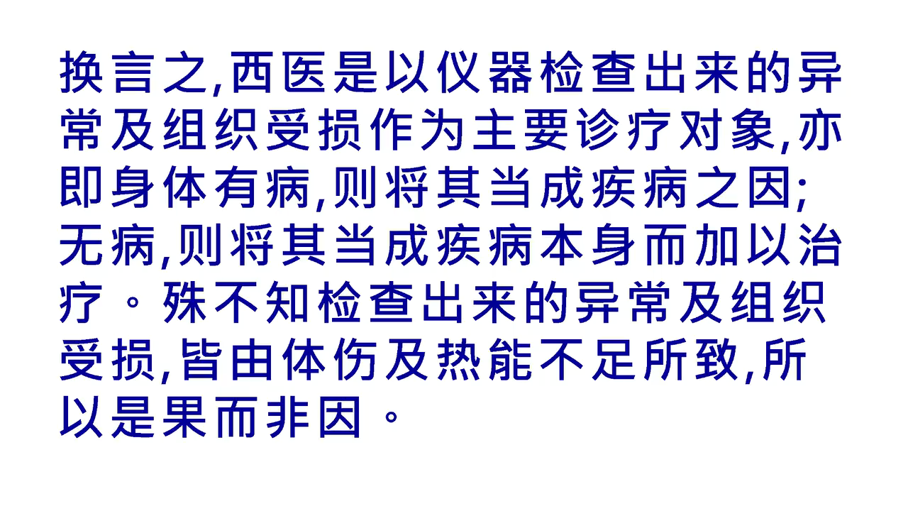 那这里就提出来,异常怎么会是因呢?异常不就是由体伤跟热能不足所导致的吗?所以它是果而非因,也就是因为这样,它不是因。所以你即便吃药或通过手术让这个异常恢复正常了,但症状也未必改善。为什么?因为老跟病是没有因果关系的,所以你异常恢复正常,症状还在也常见这个临床上也常见,所以从临床上就可以看出,西医这样的理论是经不起考验。